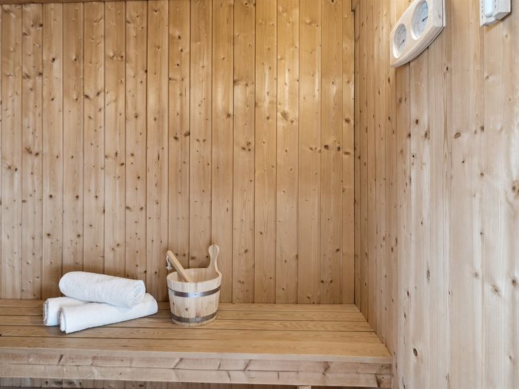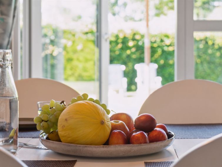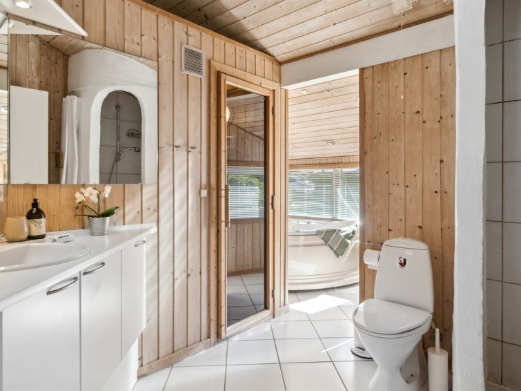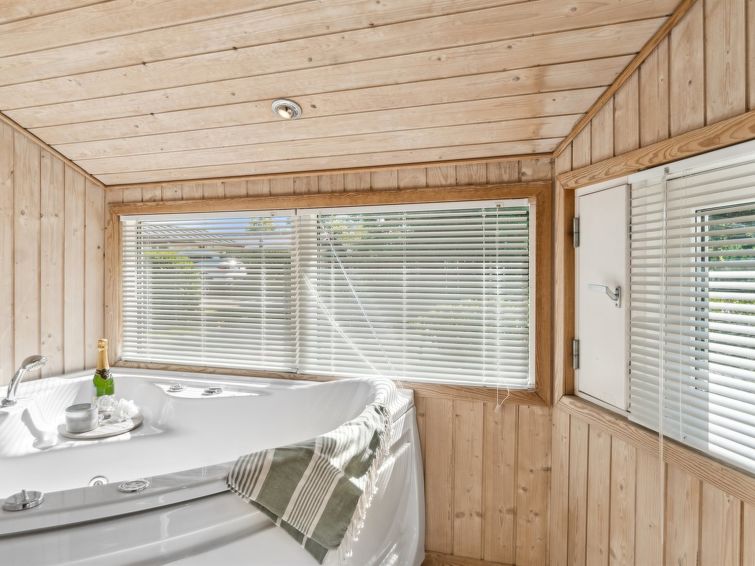 Enmannsbolig, bygget i 2002. 525 m fra sjøen. Privat: tomt 885 m2, velholdt hage. Terrasse (30 m2), grill. I huset: badstu, fotballsbord, vaskemaskin. Parkering ved hbrukt. Daglivarehandel 300 m. Golfbane 11.6 km. Eieren godtar ikke noen ungdomsgrupper.