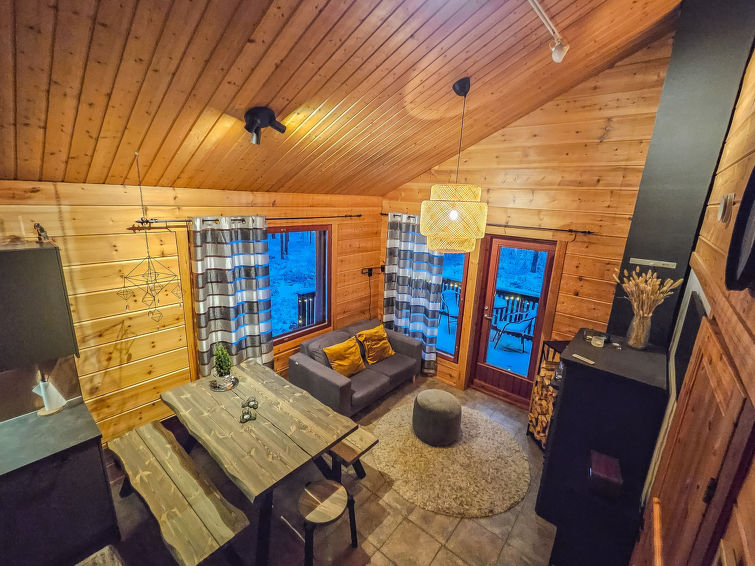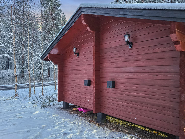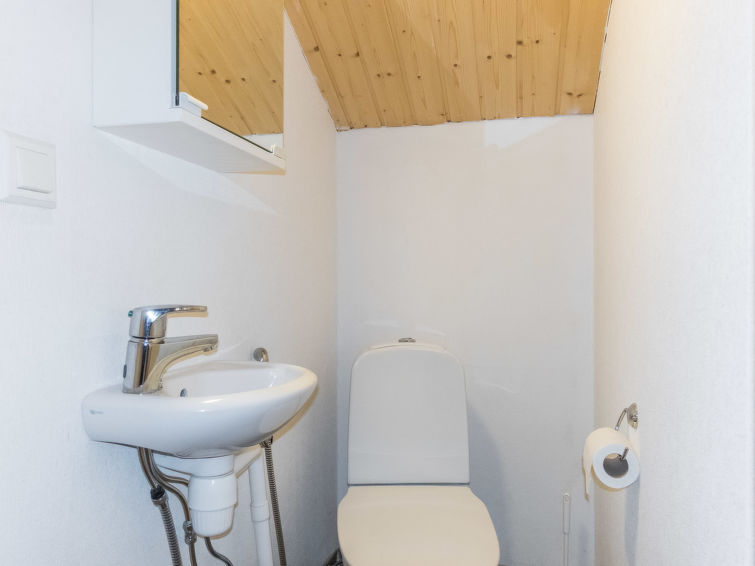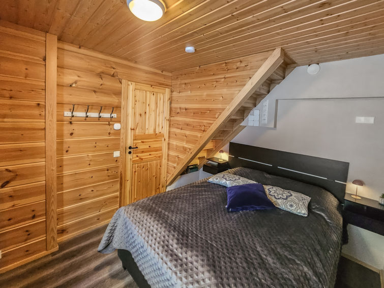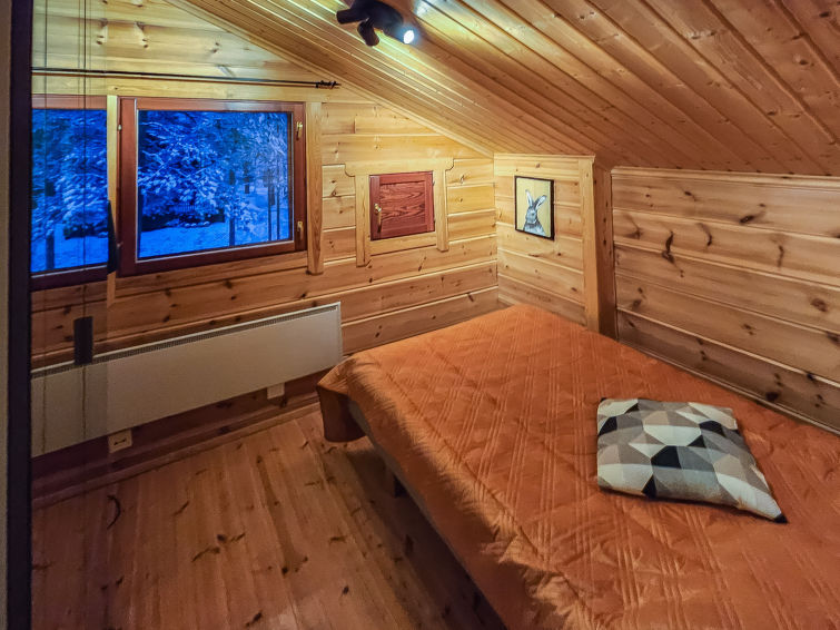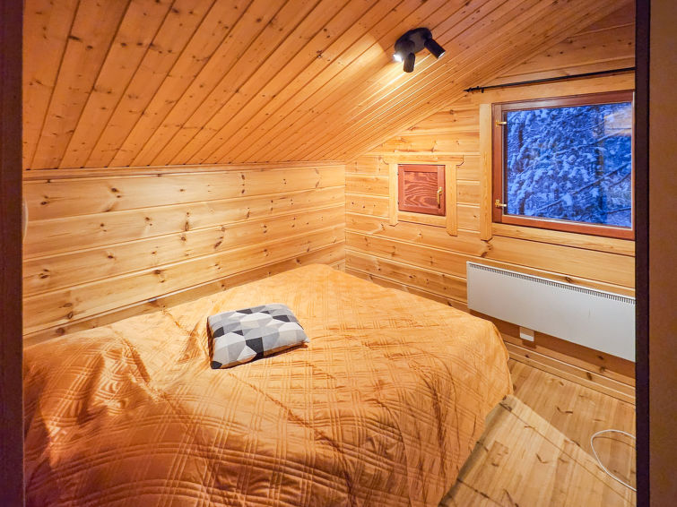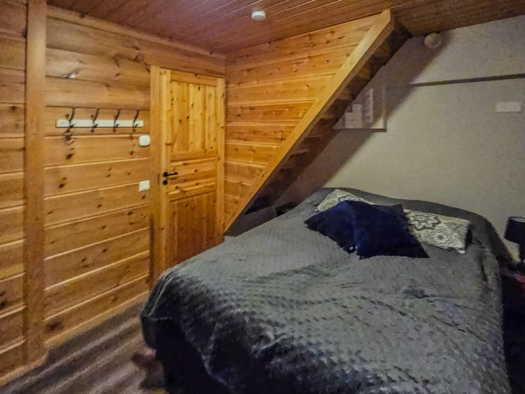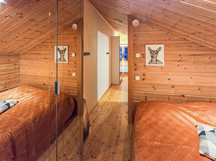 Semi-detached house, inside paneled, built in 2006. Downstairs kitchen, bedroom with 2 single beds, sauna (electric stove), washroom / toilet, open porch. Upstairs alcove with 2 single beds and another alcove with 1 single bed (120 cm), toilet also upstairs. 2 TVs.