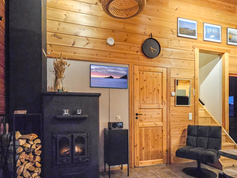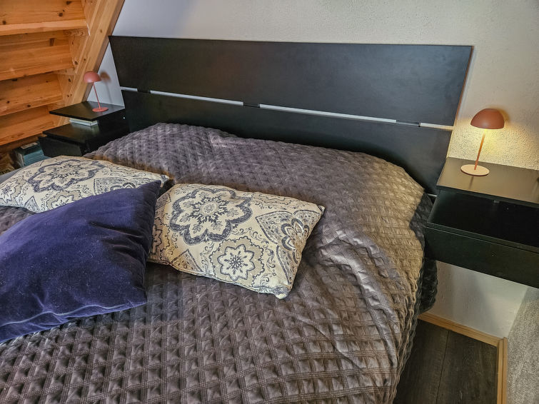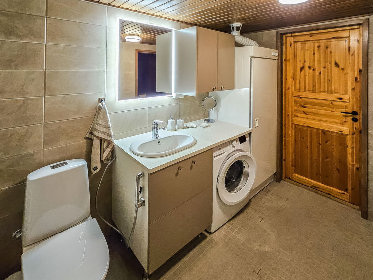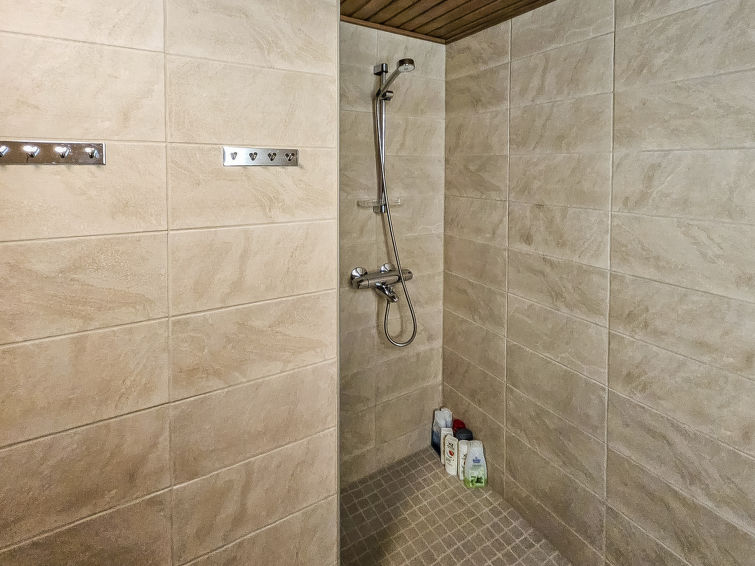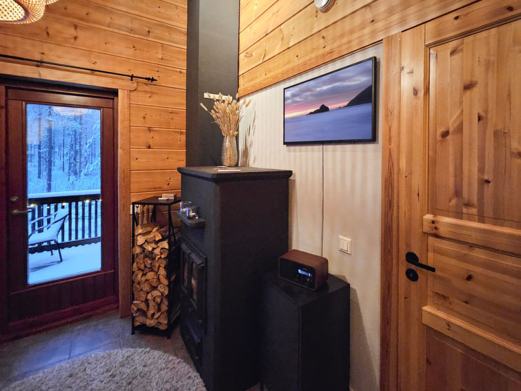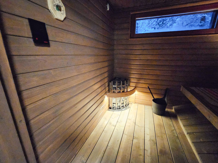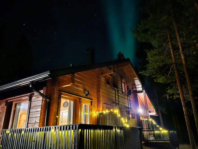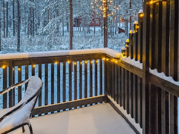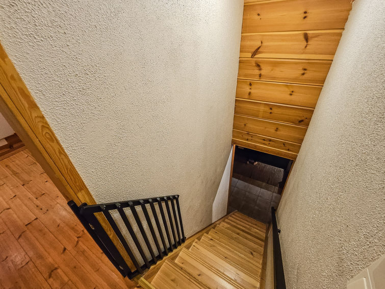 Semi-detached house, inside paneled, built in 2006. Downstairs kitchen, bedroom with 2 single beds, sauna (electric stove), washroom / toilet, open porch. Upstairs alcove with 2 single beds and another alcove with 1 single bed (120 cm), toilet also upstairs. 2 TVs.