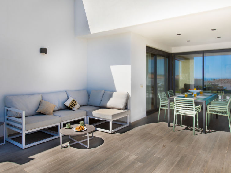 "Royal", 4 rom halvpart av tomannsbolig 120 m2, beliggenhet mot sør. Lys, komfortabelt og moderne møbler: stue/spisestue med, digital TV, air-conditioning og varmluft oppvarming. Utgang til terrassen. 1 rom med 2 senger (90 cm lengde 190 cm), air-conditioning og varmluft oppvarming. 1 rom med 2 senger (90 cm lengde 190 cm), air-conditioning og varmluft oppvarming. 1 rom med, 1 dobbeltseng (150 cm, lengde 190 cm), dusj/WC, air-conditioning og varmluft oppvarming. Åpent kjøkken (stekeovn, oppvaskmaskin, 4 keramiske kokeplater, brødrister, vannkoker, mikrobølgeovn, frys, elektrisk kaffemaskin). Dusj/WC. Stor terrasse. Terrassemøbler, grill, liggestoler. Ved siden utsikt av havet og fjellene. Fasiliteter: vaskemaskin, strykejern, høy barnestol barneseng, hårføner. Internett (trådløs LAN [WLAN], gratis). VFT/MA/51075