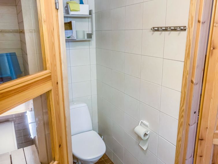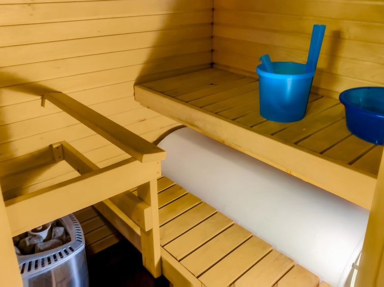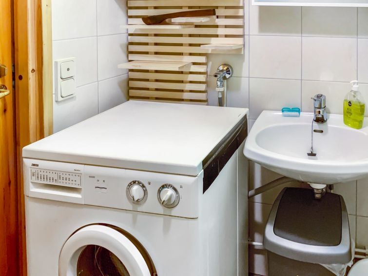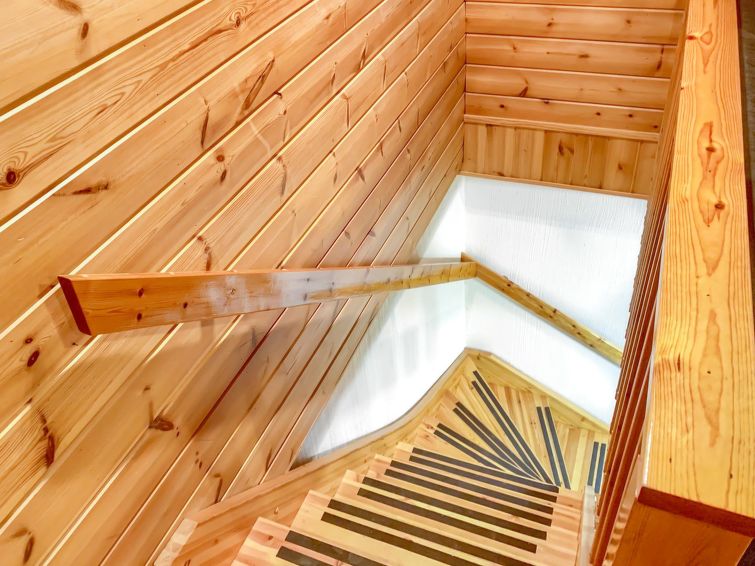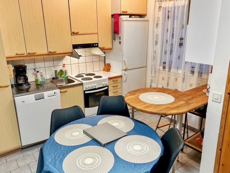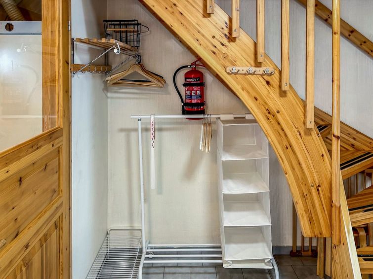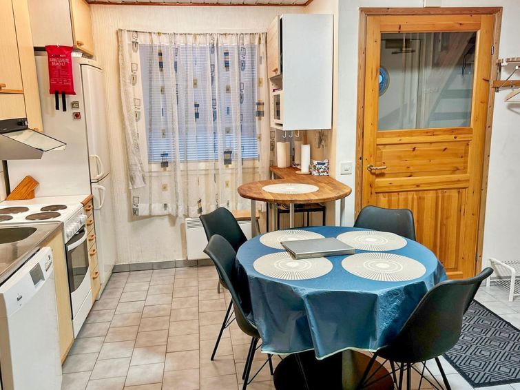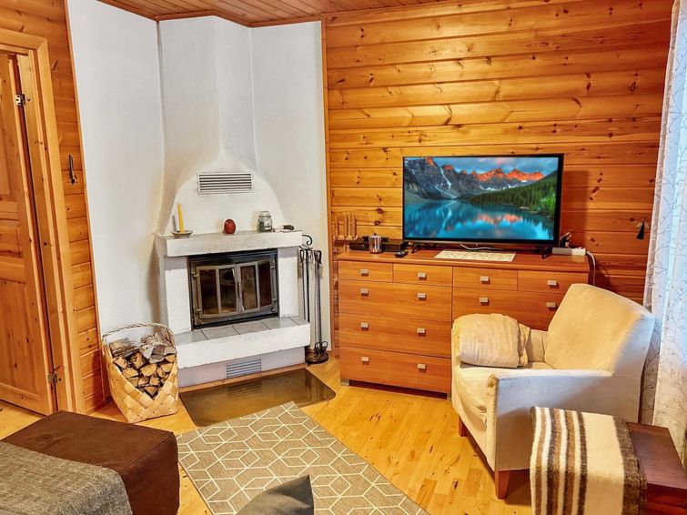 Apartment in log-built two-storey row house, built in 1988. Downstairs: combined kitchen/living room and electric sauna.