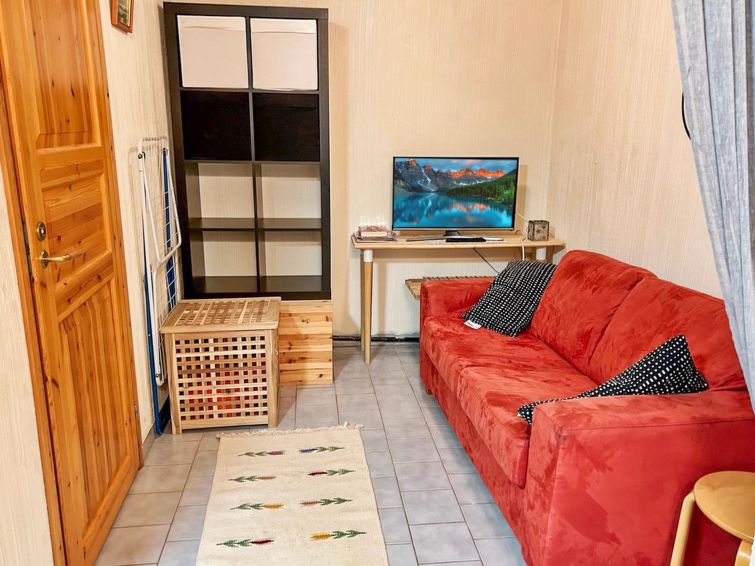 Upstairs: bedroom with double bed and single bed, living room with sofa bed for two. Downstairs: sofa bed for 2.