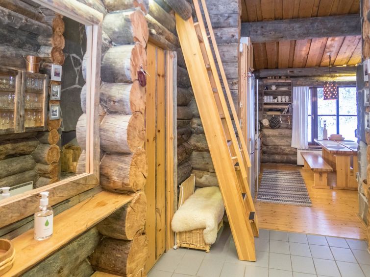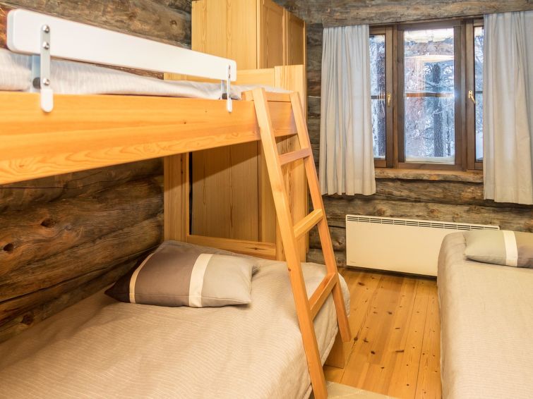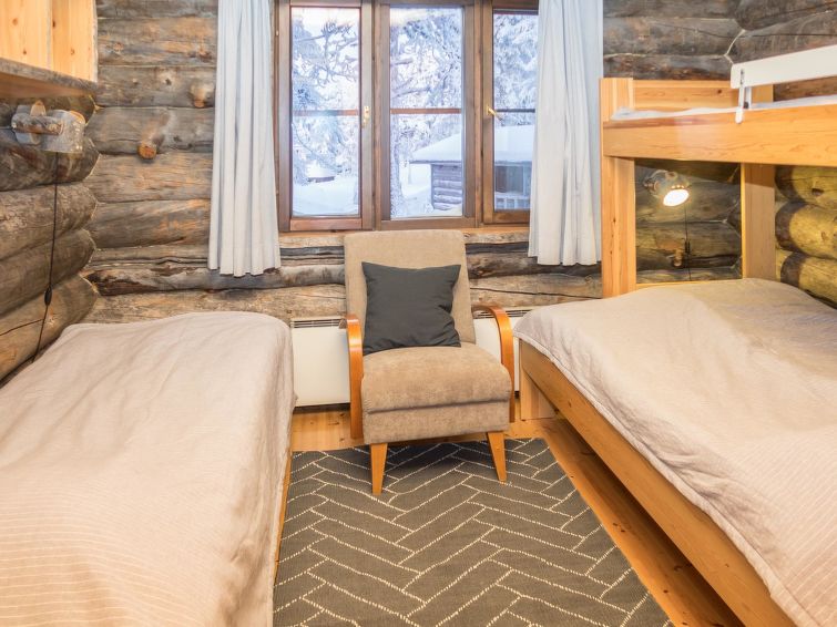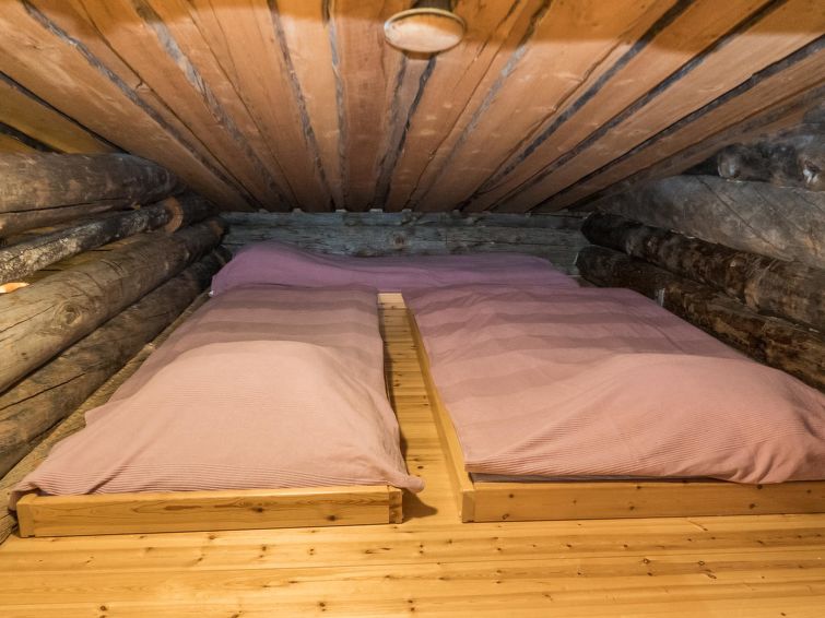 From Kuusamo to north 25 km, Ruka Village (West Ruka) 2 km, Vuosseli (East Ruka) 3 km. 1992 built semi-detached kelo log cabin, bedroom 1: bed + bunk bed, bedroom 2: bed + bunk bed, loft (steep stairs): double bed + 3 matresses. Combined kitchen + living room. Electric sauna. Apartment is located on a slope landscape, near Hotel Royal Ruka. Other apartment in the house is 9478 Rukapuro.