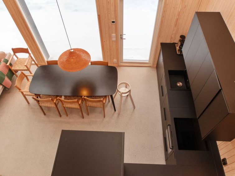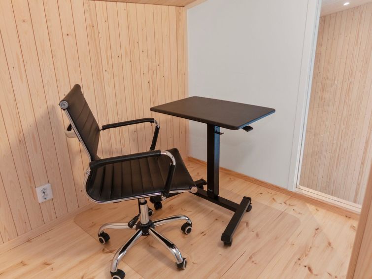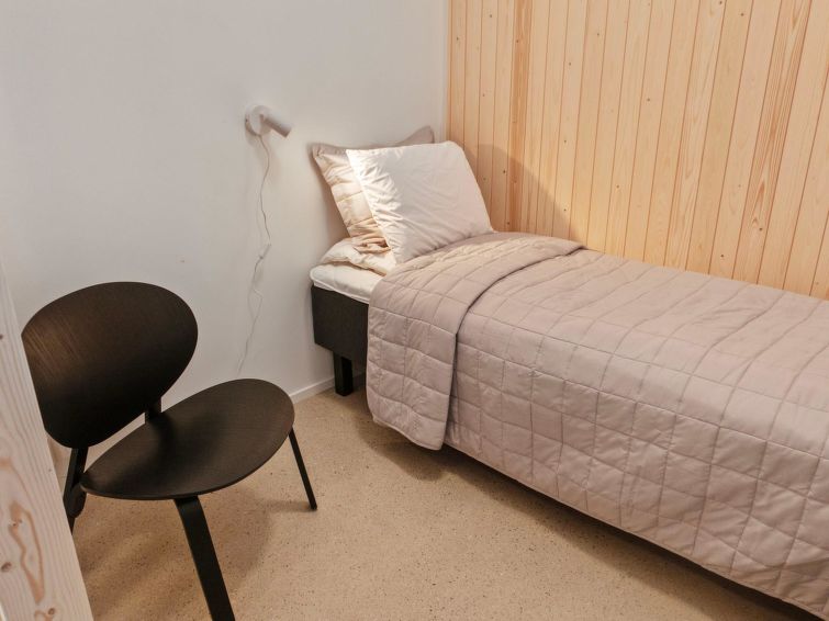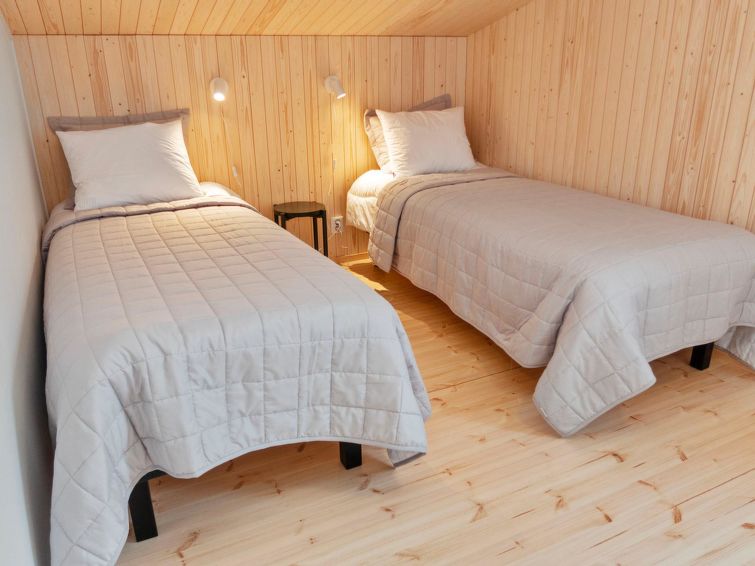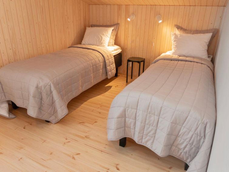 On the ground floor, a bedroom with double bed and sleeping alcove with single bed. The cabin has two bedrooms on the upper floor with 2 single beds in each. In addition, there is a bed in the upper floor lobby. There is also a desk for remote working.