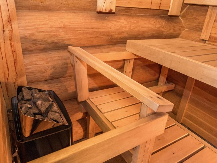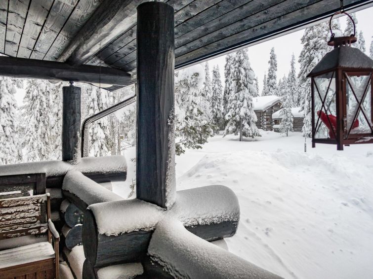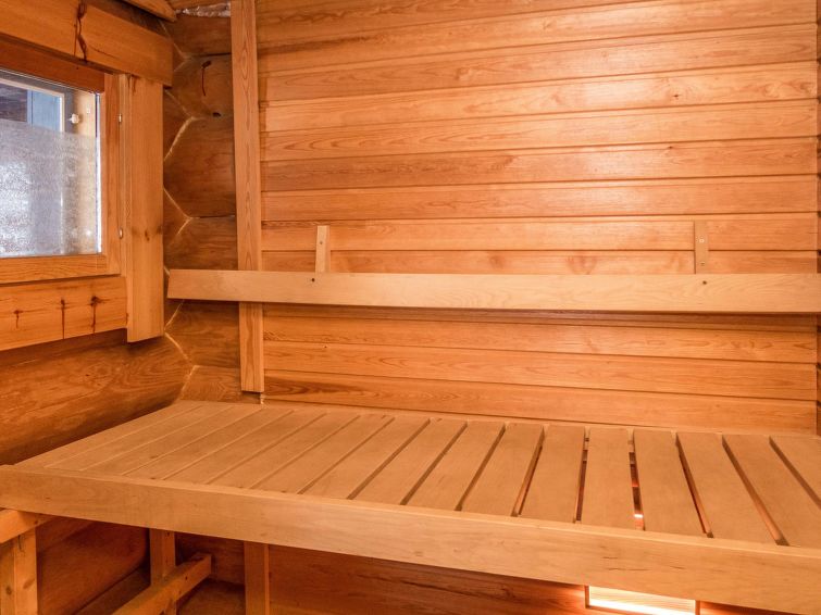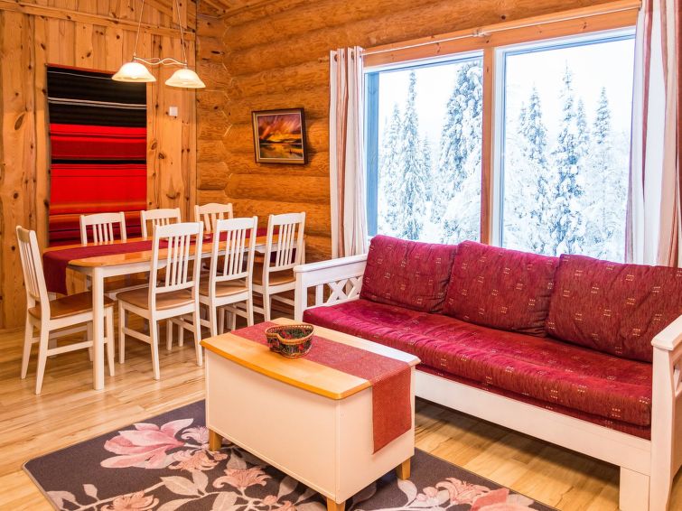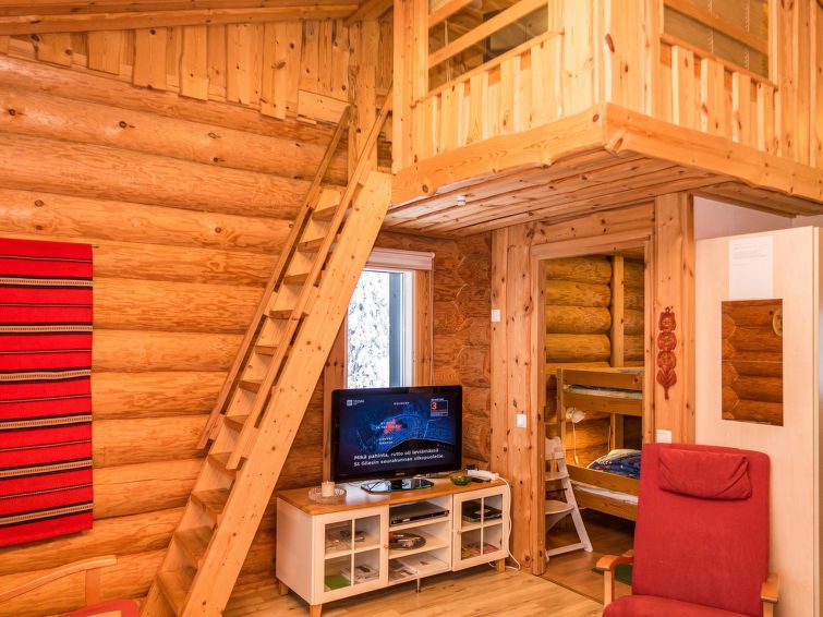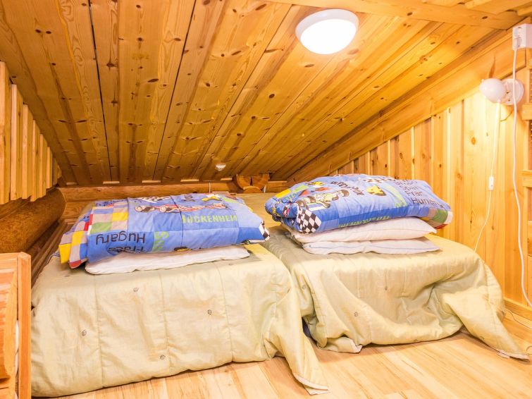25km north of Kuusamo, Vuosseli (Eastern Ruka) 400m, Ruka village (Western Ruka) 4,3 km. Log-built holiday apartment, built in 2005, bedroom 1: double bed, bedroom 2: bunk bed (lower bed can be spread), loft (9 m², steep stairs): 2 beds, combined kitchen/living room, electric sauna.