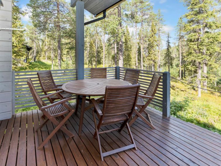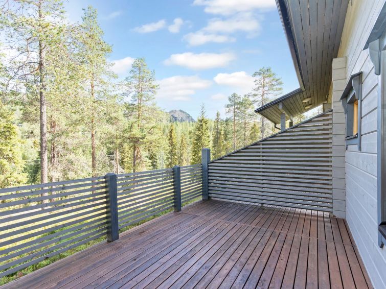 23 km north of Kuusamo, two-storey semi-detached house made of log in 2007, a view to the hills from the sheltered terrace.