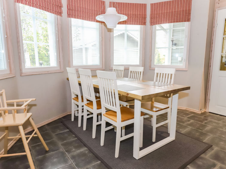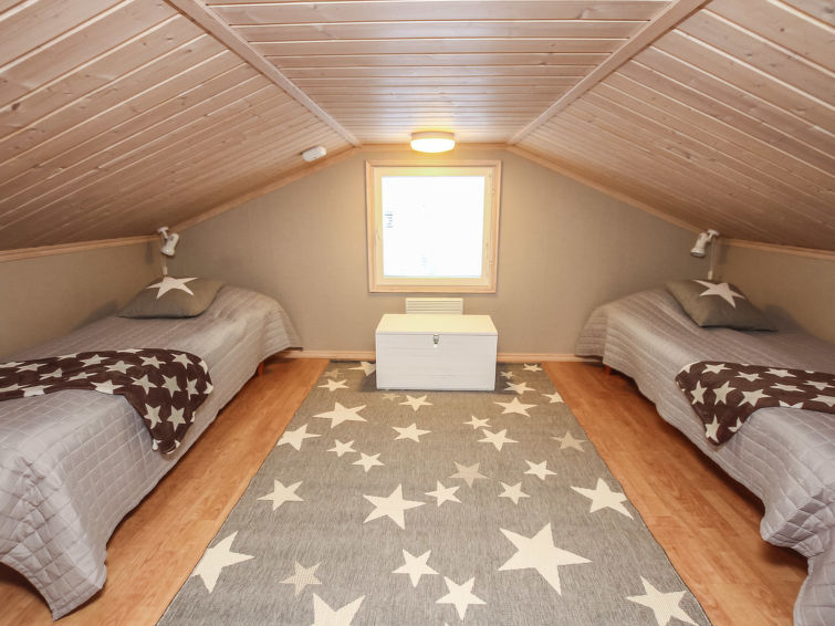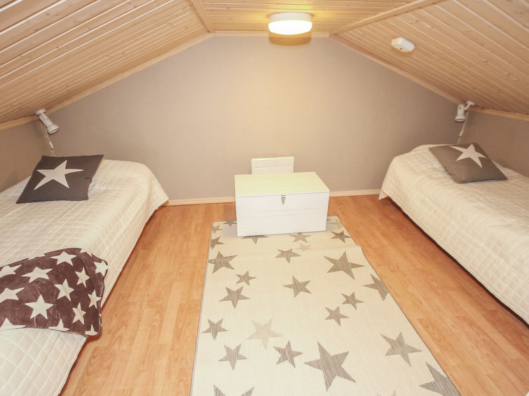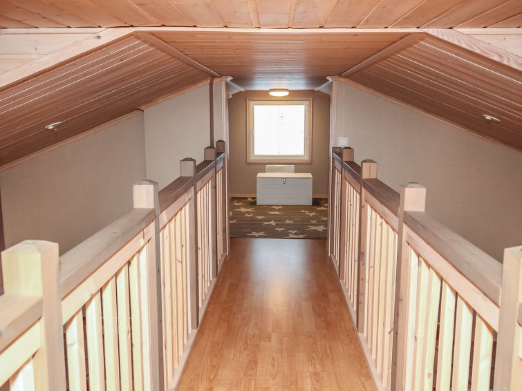 Cosy log-panelled apartment in semi-detached house, built in 2005, downstairs two bedrooms one with 2 beds and other with double bed, lofts 1-2 with total 4 single beds (2 beds/alcove, sloping ceilings, maximum height 160 cm, floorage 33 m²), steep stairs to the loft, child safety gate in the loft.