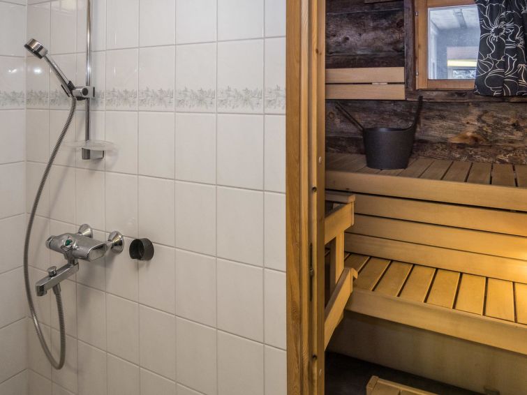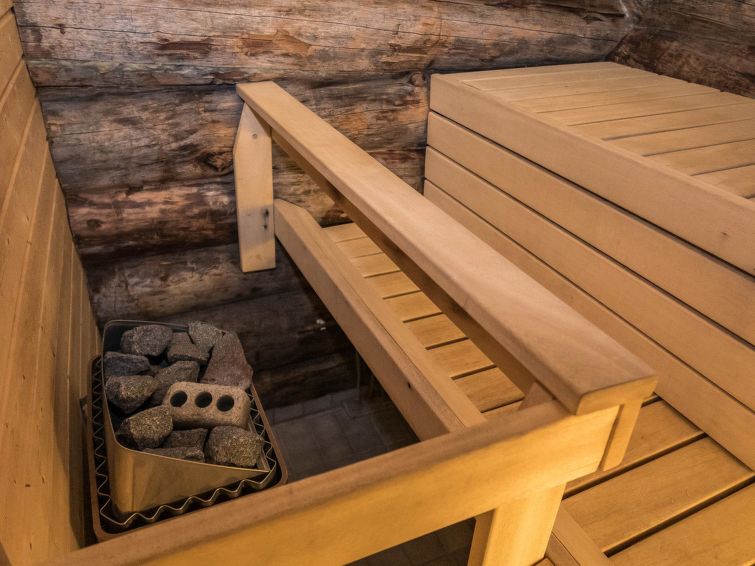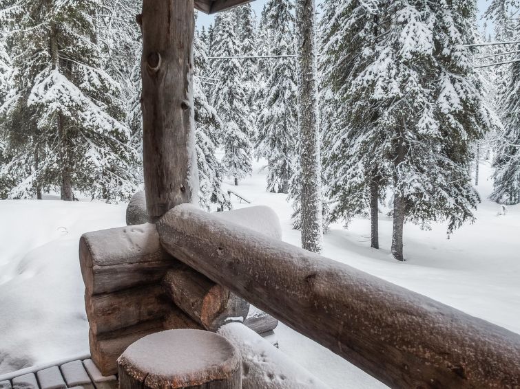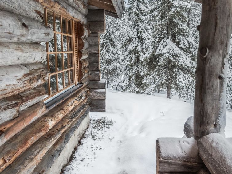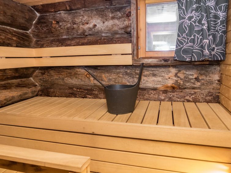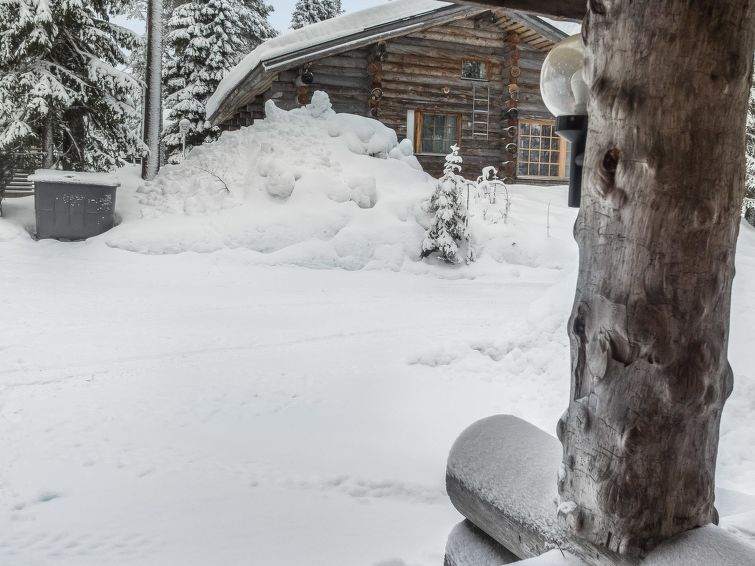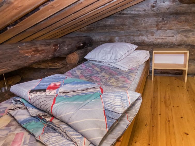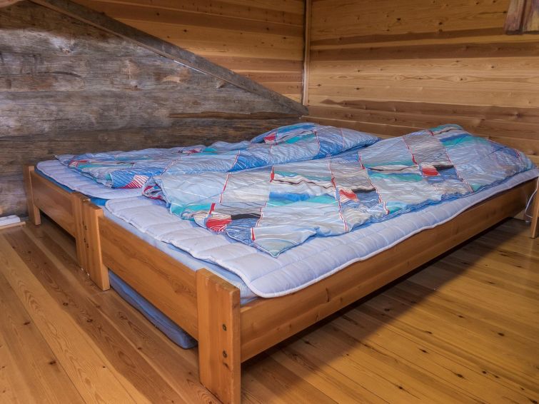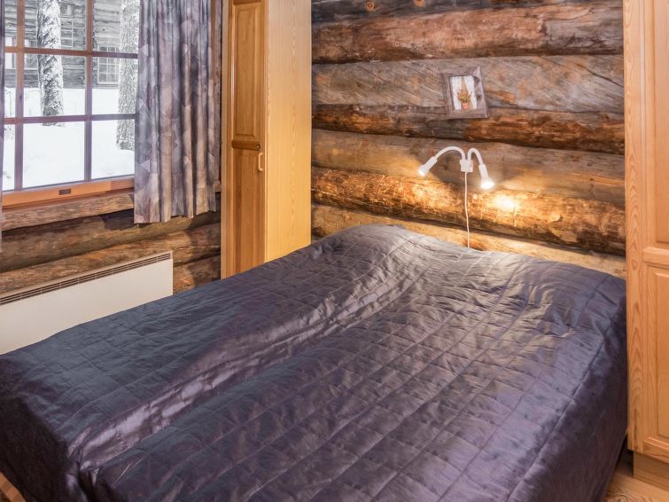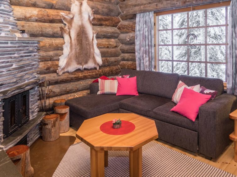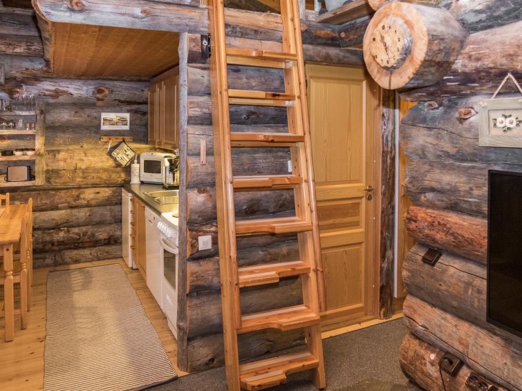 Semi-detached log house, built in 1990, bedroom: 2 beds, loft (12 m², sloping ceilings, steep ladder to the loft): 3 beds + 2 mattresses, combined kitchen/living room (sofa bed for 2), electric sauna. Cottage area near by road nr 5 (E63), on south side of Ruka fell.