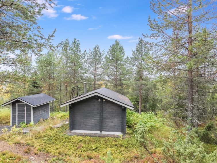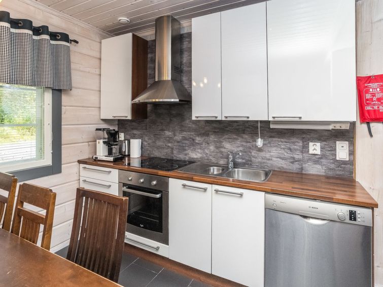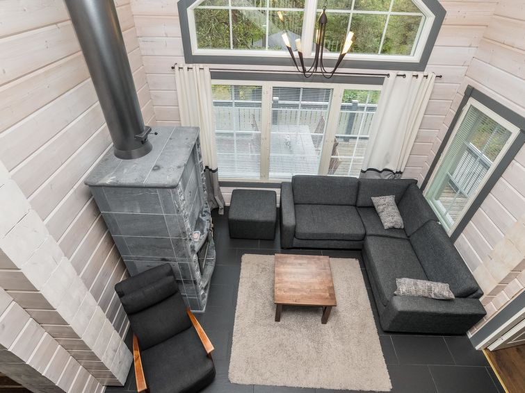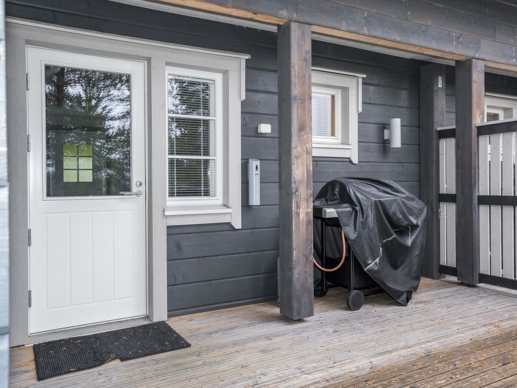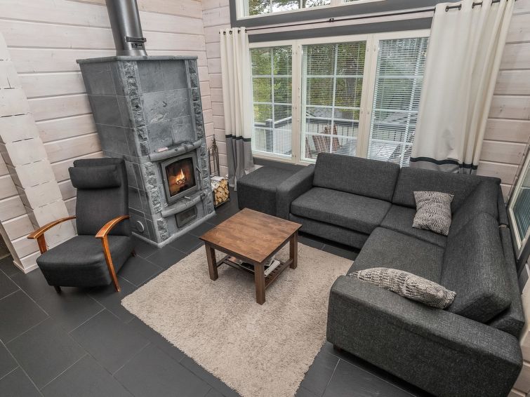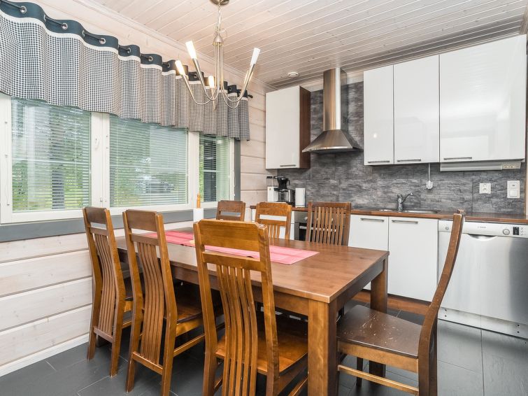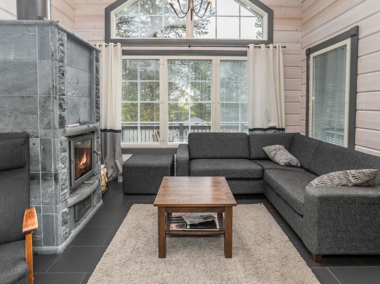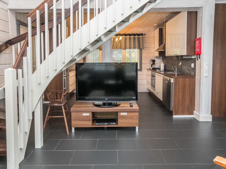 27 km to the north from Kuusamo, Vuosseli (Eastern Ruka) 1,5 km, Ruka village (Western Ruka, Central Square) 5,7 km. View to the lake Vuosselijärvi (200m to the lake, no swimming beach). Half of the semi-detached log cottage, built in 2011, kitchen, living room, fireplace, bedroom 1: two beds, bedroom 2: two beds, loft: in both ends two beds, shower room, sauna (electric stove), two toilets, terrace. Also separate sauna (heating with wood) in the yard. Materials and furniture of the cottage are of high quality. High windows in the living room add brightness to the cottage. There is a beautiful view to the lake Vuosselijärvi from the living room and from the large terrace you can see the fell. In the yard is a separate outdoor sauna (other sauna is in use of the customers in A-side). Distance is ca. 200 m to the lake Vuosselijärvi, where you have access to the snowmobile route in winter. There are high chair, two televisions and in summer gas grill in the cottage.