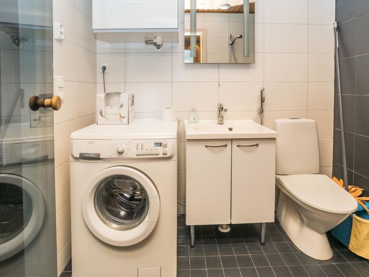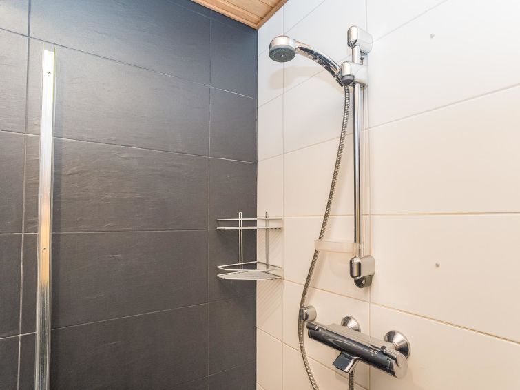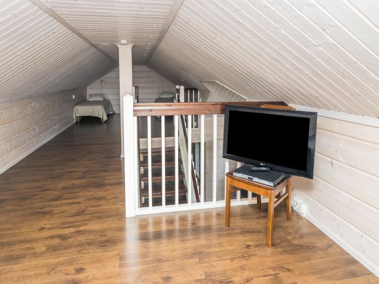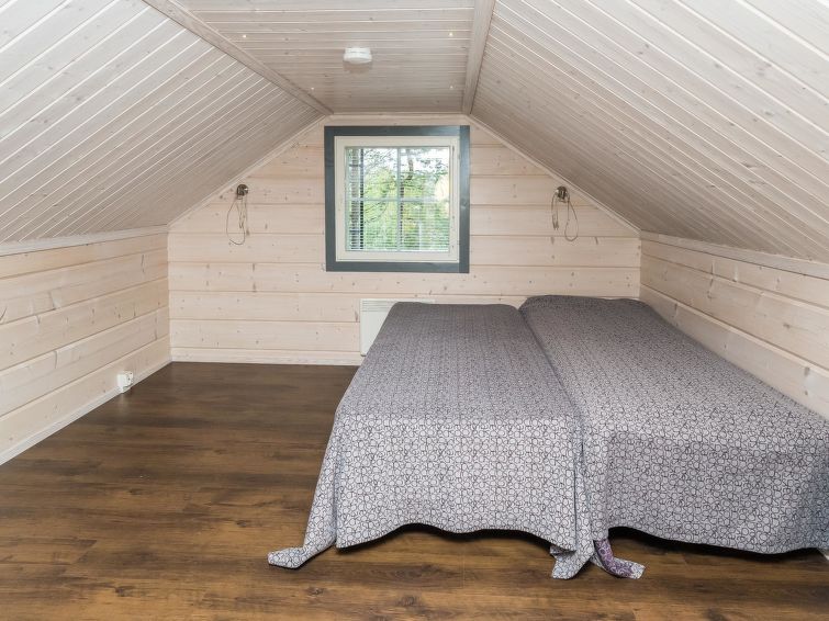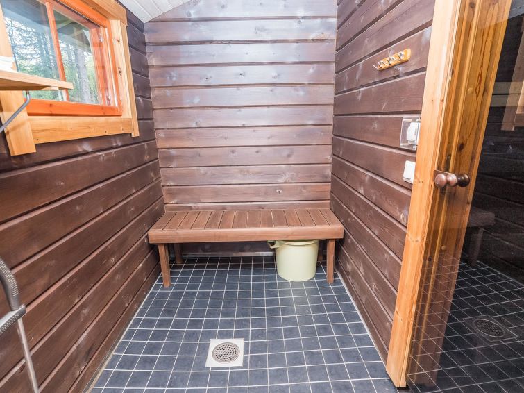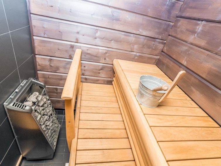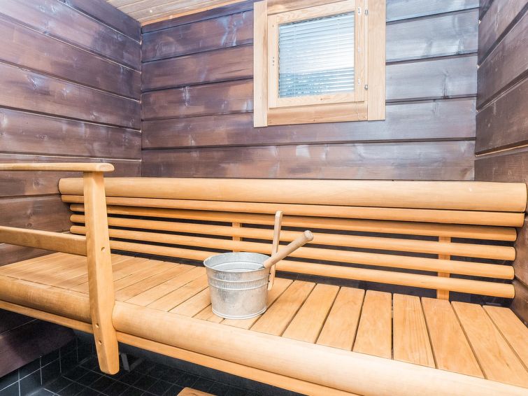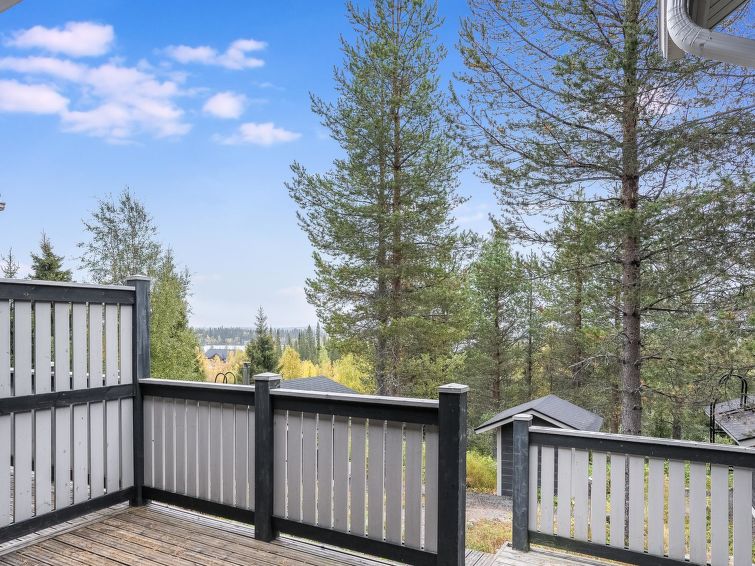 27 km to the north from Kuusamo, Vuosseli (Eastern Ruka) 1,5 km, Ruka village (Western Ruka, Central Square) 5,7 km. View to the lake Vuosselijärvi (200m to the lake, no swimming beach). Half of the semi-detached log cottage, built in 2011, kitchen, living room, fireplace, bedroom 1: two beds, bedroom 2: two beds, loft: in both ends two beds, shower room, sauna (electric stove), two toilets, terrace. Also separate sauna (heating with wood) in the yard. Materials and furniture of the cottage are of high quality. High windows in the living room add brightness to the cottage. There is a beautiful view to the lake Vuosselijärvi from the living room and from the large terrace you can see the fell. In the yard is a separate outdoor sauna (other sauna is in use of the customers in A-side). Distance is ca. 200 m to the lake Vuosselijärvi, where you have access to the snowmobile route in winter. There are high chair, two televisions and in summer gas grill in the cottage.