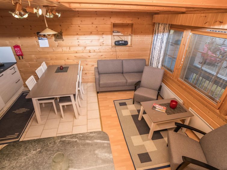 25km north of Kuusamo, Vuosseli (Eastern Ruka) 800m. Apartment in log-built semi-detached house, built in 2000, bedroom: double bed, bedroom2 (loft): 2 beds, loft: convertible sofa for two + 2 beds, combined kitchen/living room. Area 52 m² + loft 26 m², highest point 190 cm.