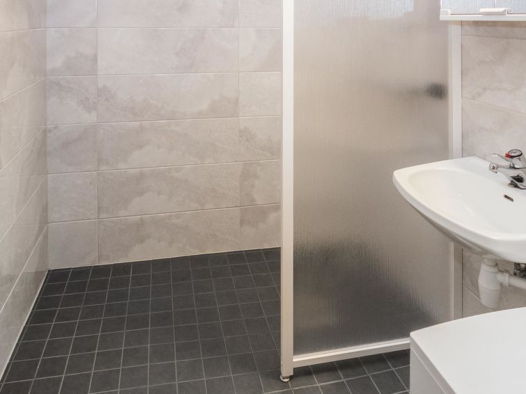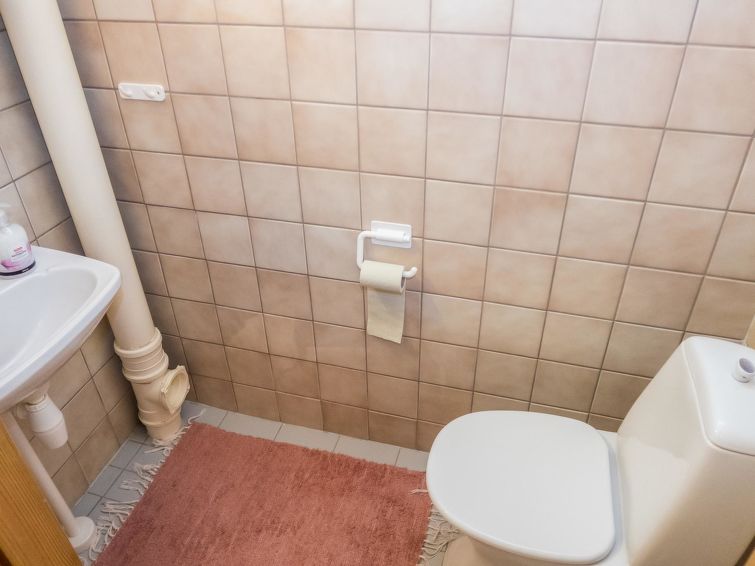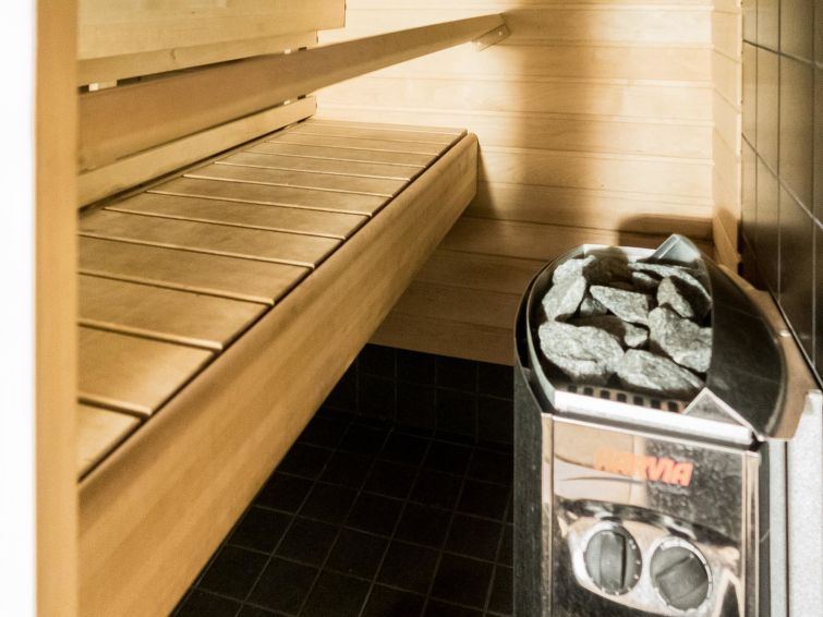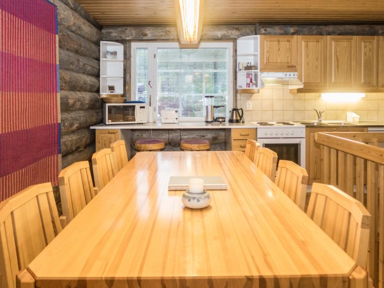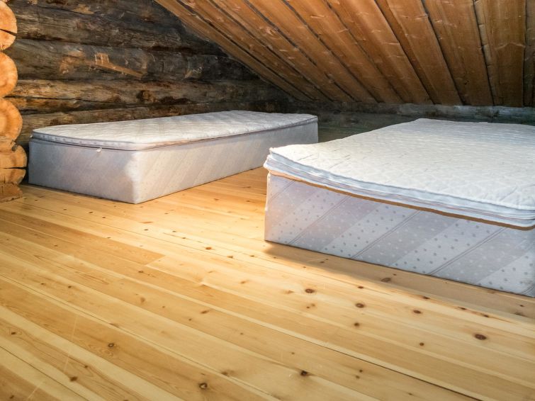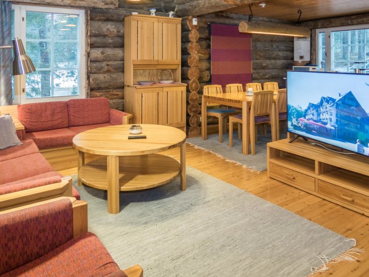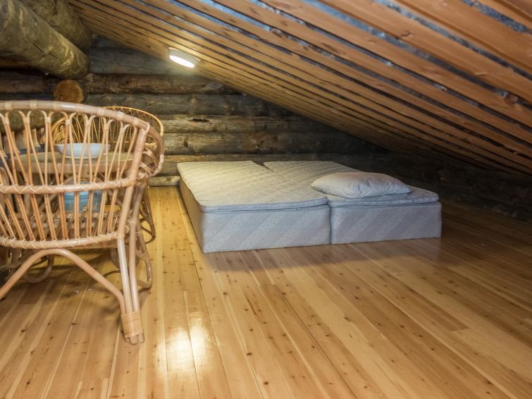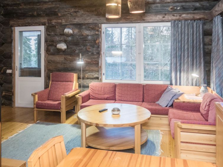 Living room, living room / kitchen, 2 bedrooms; one on the base floor with 2 beds. Another bedroom on the ground floor with 2 single beds. On the ground floor, there is also a sleeping alcove / fireplace room with spreadable sofa bed for two. 4 mattresses in the loft. Note! Maximum number of guests in the apartment is 6. Sauna (electric sauna stove), dressing room and washroom. Kelo log-built semi-detached house in a cozy area of several holiday cabins. The nearest ski lifts are Masto I and Masto II.