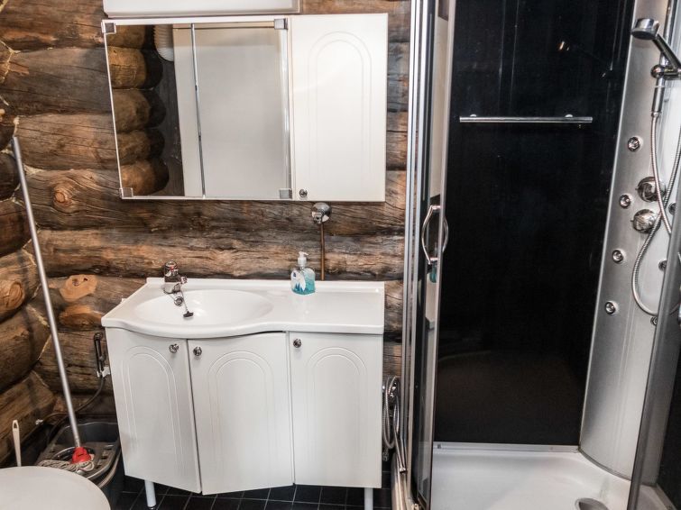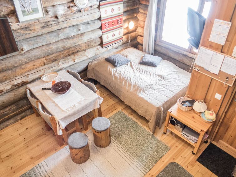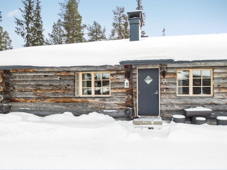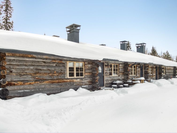 25km north of Kuusamo, Ruka 3.5km, Salmilampi pond 200m. Studio in log-built row house, built in 1987, living room: double bed (140 cm), loft (10 m², sloping ceilings, low room height, steep stairs): 2 mattresses, combined kitchen/living room, electric sauna. Studio in row house in Salmilampi pond area. Other row houses in the area.