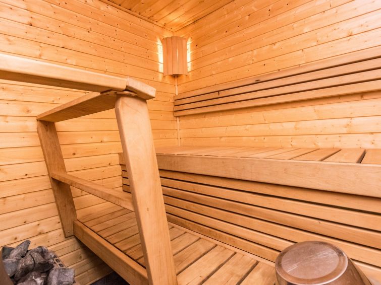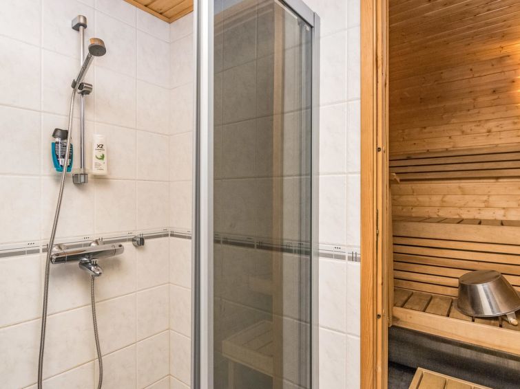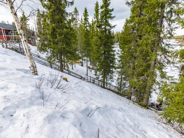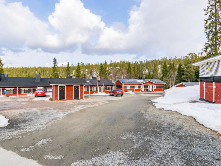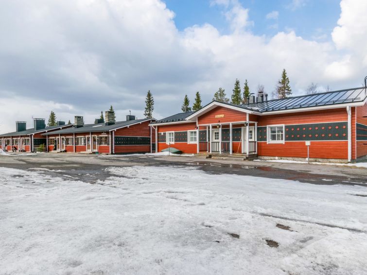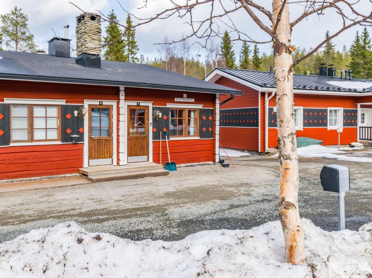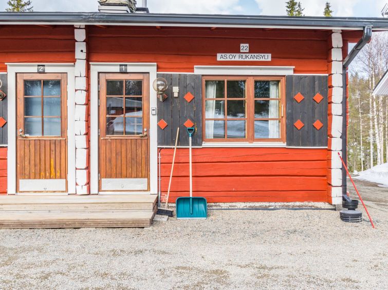 27 km north of Kuusamo, Ruka village (Western Ruka) 3 km, 50 m to the pond Salmilampi. Apartment in the terraced house on the west side of Ruka, built in 1986, renovated partially in 2005. Kitchen+living room, spreadable bed for two, fireplace, loft (steep stairs) with 2 single beds, toilet/shower room and sauna. Downstairs 30 m² + loft 8 m². Cosy apartment in the terraced house in the west side of Ruka close to the activities, only ca. 50 m to ski trail and Skibus stop, ca. 400 m to snowmobile route and 3 km to the slopes and services of Ruka. The nearest ski trail is on a pond, maintenance of the trail starts from the week 8. The closest lift is only ca. 1 km away, if you cross the lake Talvijärvi. Excellent apartment for couple, small family or group of friends. Hand carved massive log used in external walls and big fireplace bring nice atmosphere to the apartment.