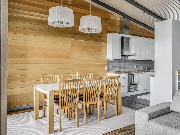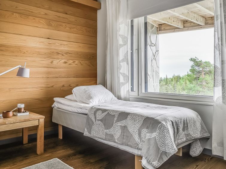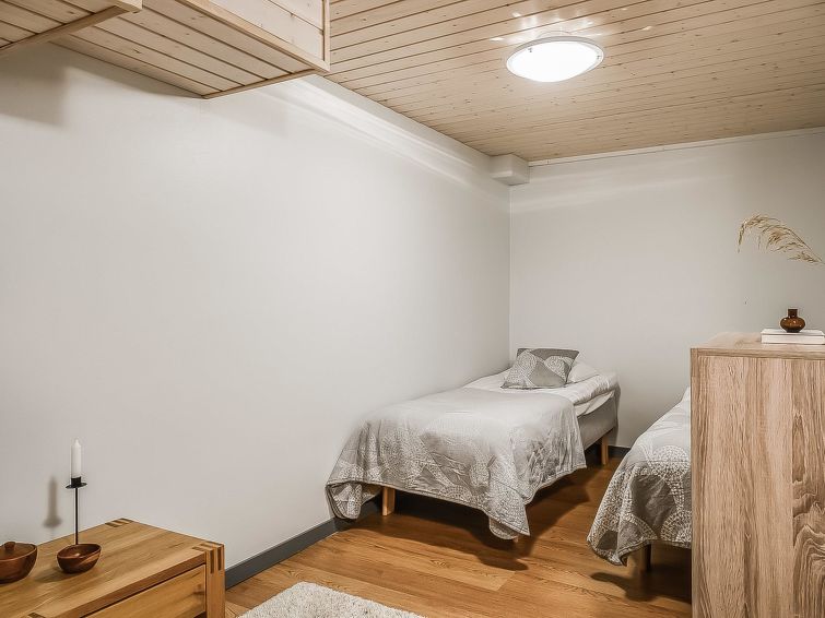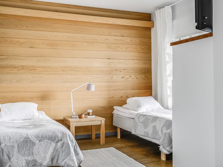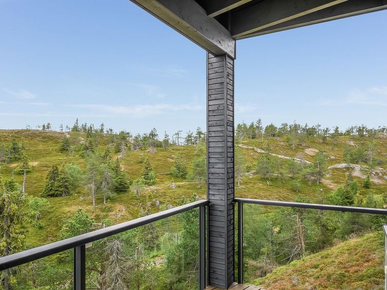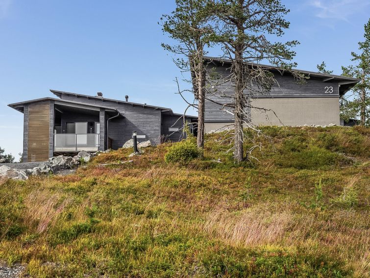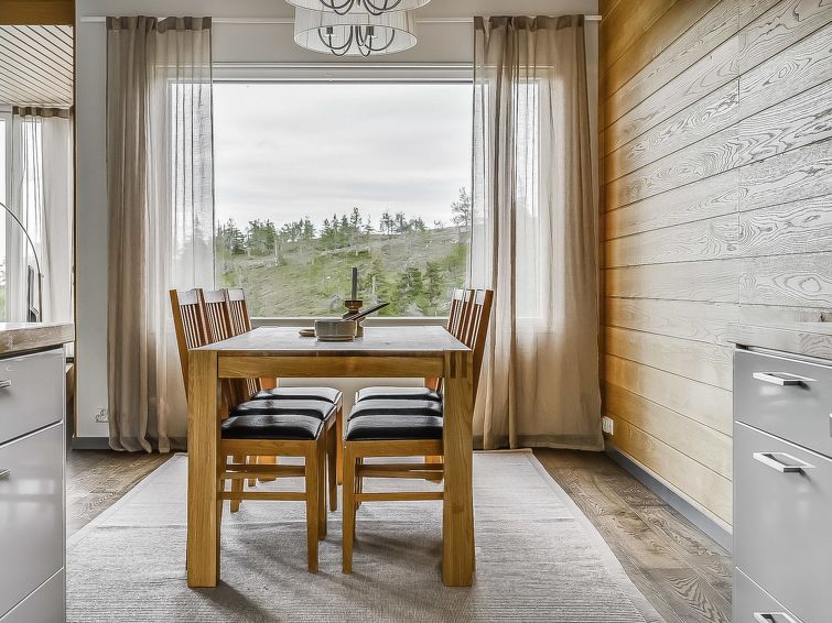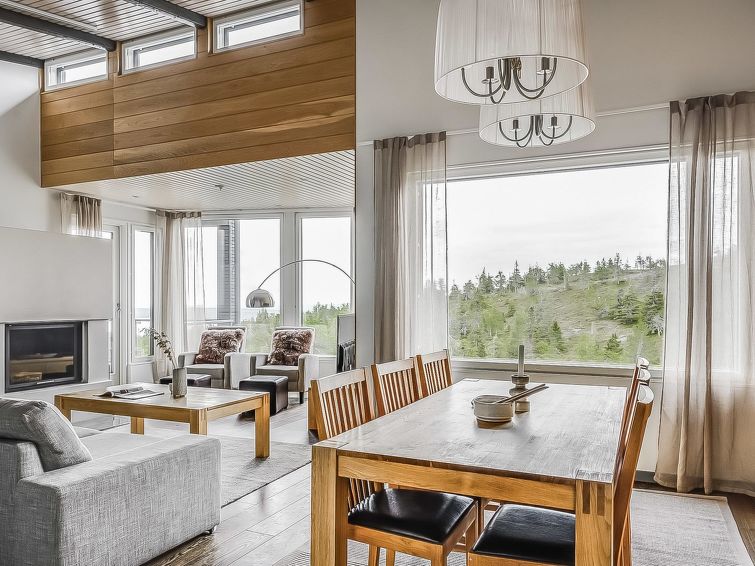 Upstairs: two bedrooms with 2 beds/bedroom. Downstairs: two bedrooms with 2 beds/bedroom, also a room with 120cm-wide bed (this room is without window, but there is a door), and a room with 3 beds (this room is also without window, but there is a door). Beds can be combined together. Combined living room/kitchen, electric sauna. Totally 3 toilets and showers. Bed linen and final cleaning are included in the price. Apartment of a high level, located at the summit of Rukatunturi Fell, next to the Masto slopes, by crossing the Juhannuskalliontie road you can reach the Masto-slopes. The ski track is located in close proximity to. Apartment is in a rocky and cliffy surroundings.