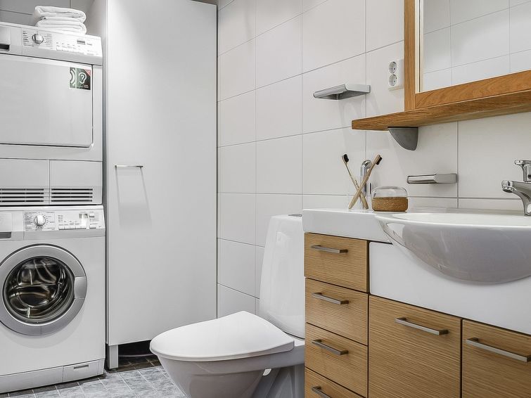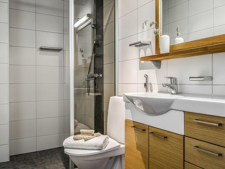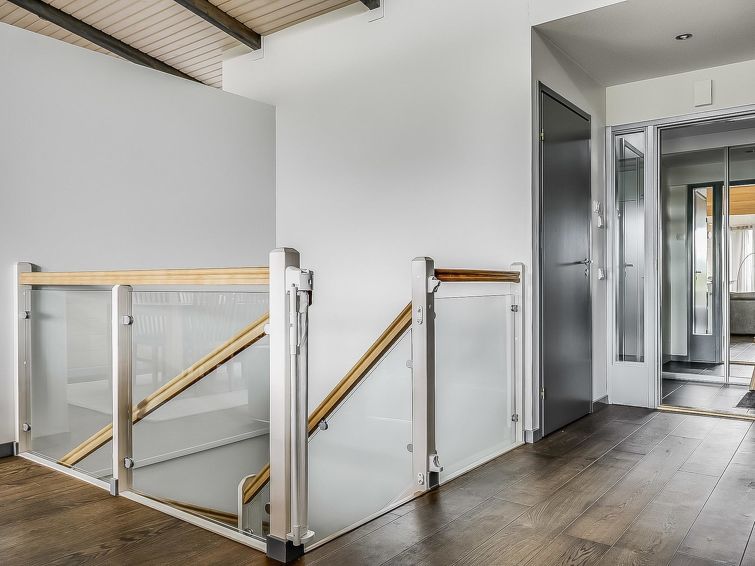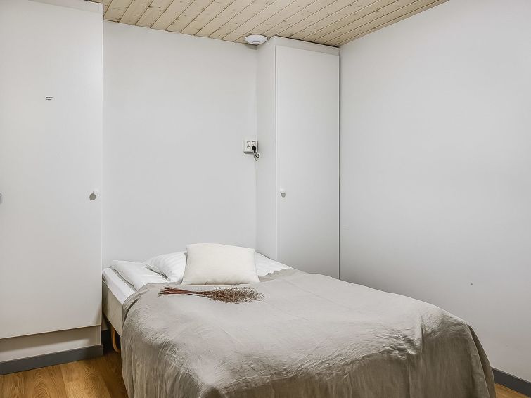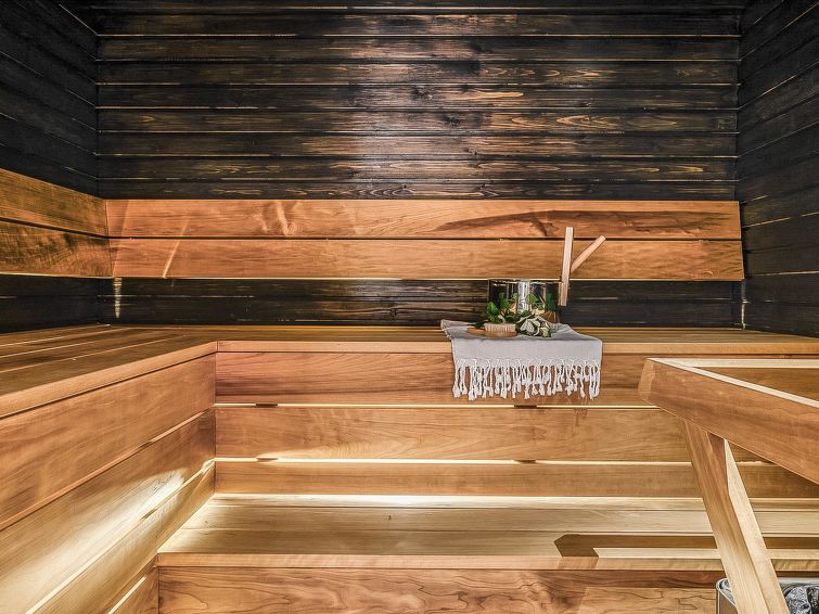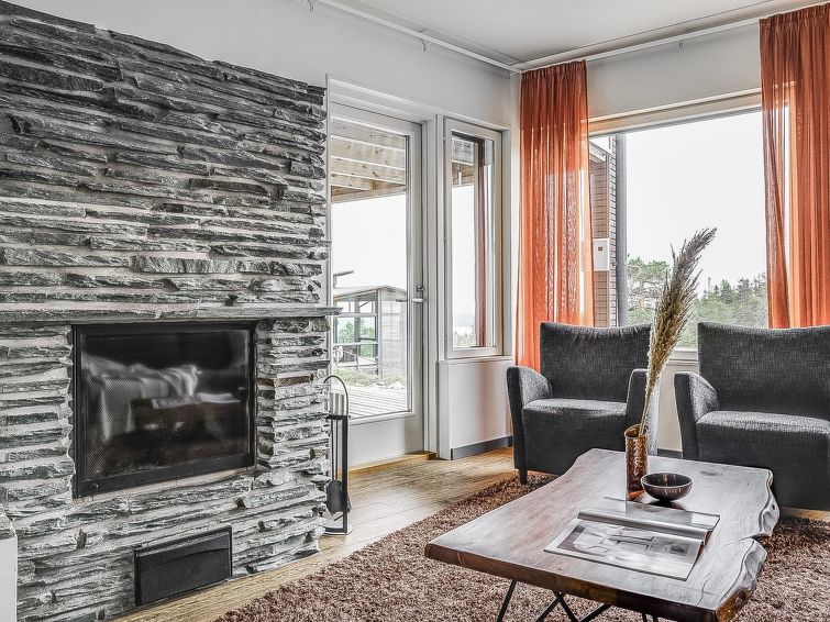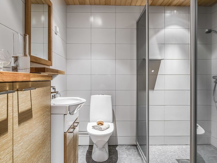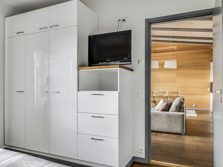 Upstairs: two bedrooms with 2 beds/bedroom. Downstairs: two bedrooms with 2 beds/bedroom, also a room with 120cm-wide bed (this room is without window, but there is a door), and a room with 3 beds (this room is also without window, but there is a door). Beds can be combined together. Combined living room/kitchen, electric sauna. Totally 3 toilets and showers. Bed linen and final cleaning are included in the price. Apartment of a high level, located at the summit of Rukatunturi Fell, next to the Masto slopes, by crossing the Juhannuskalliontie road you can reach the Masto-slopes. The ski track is located in close proximity to. Apartment is in a rocky and cliffy surroundings.