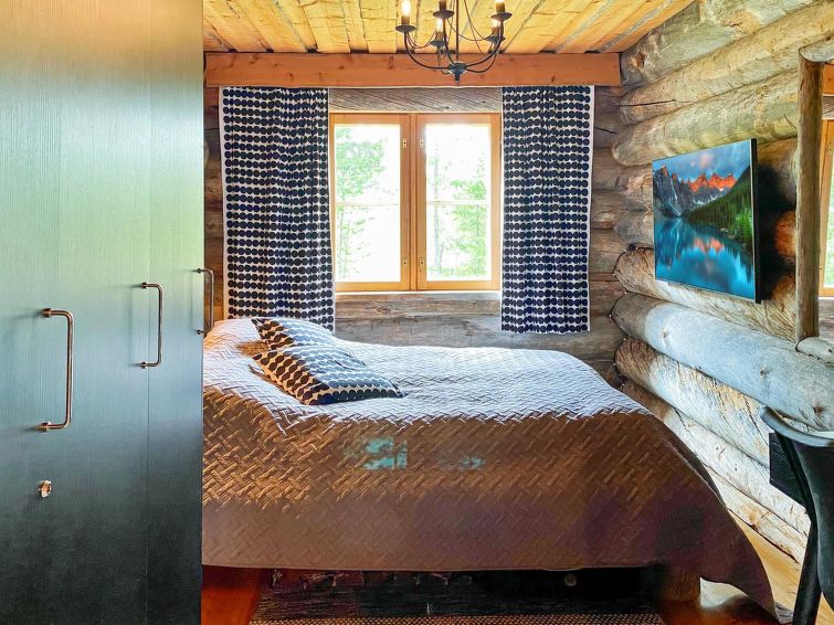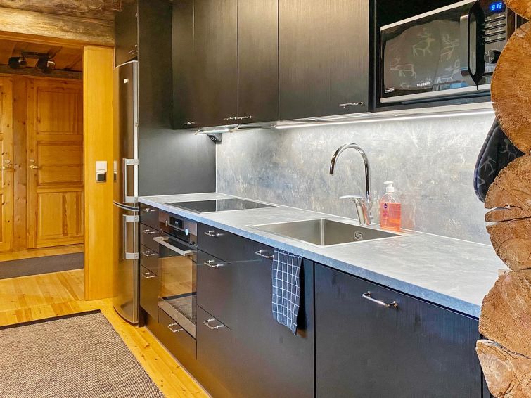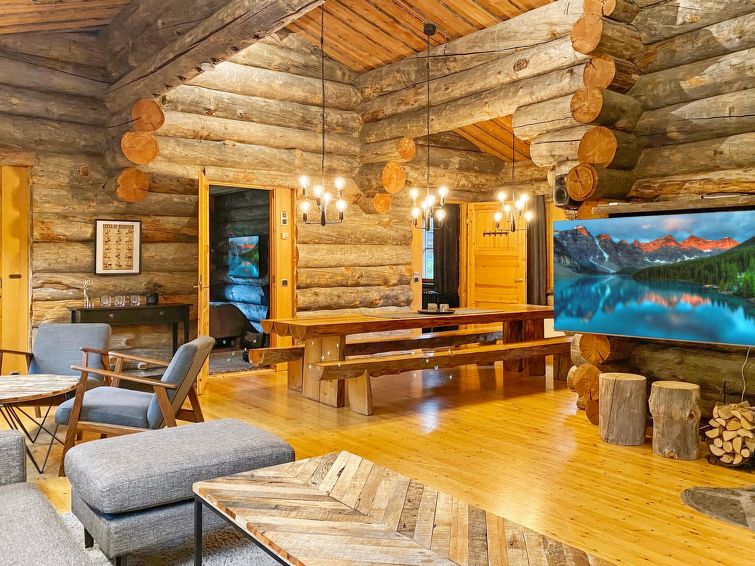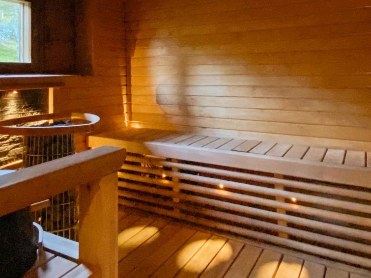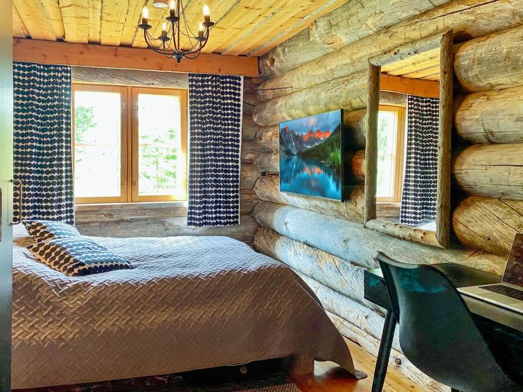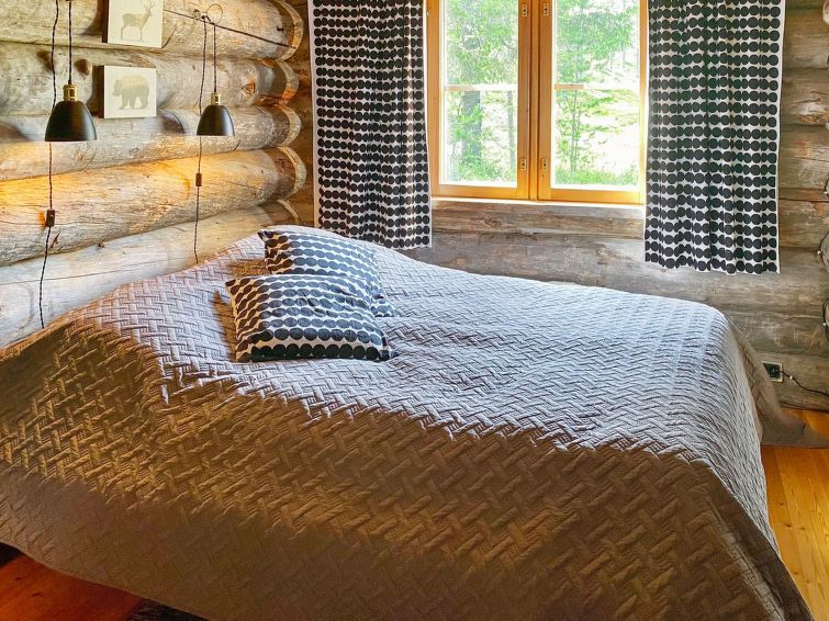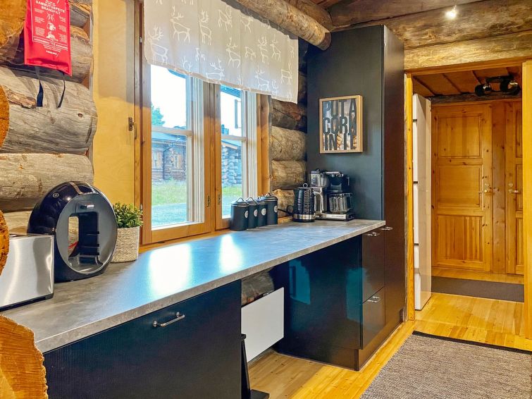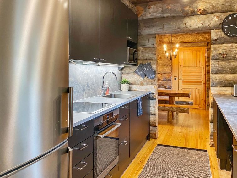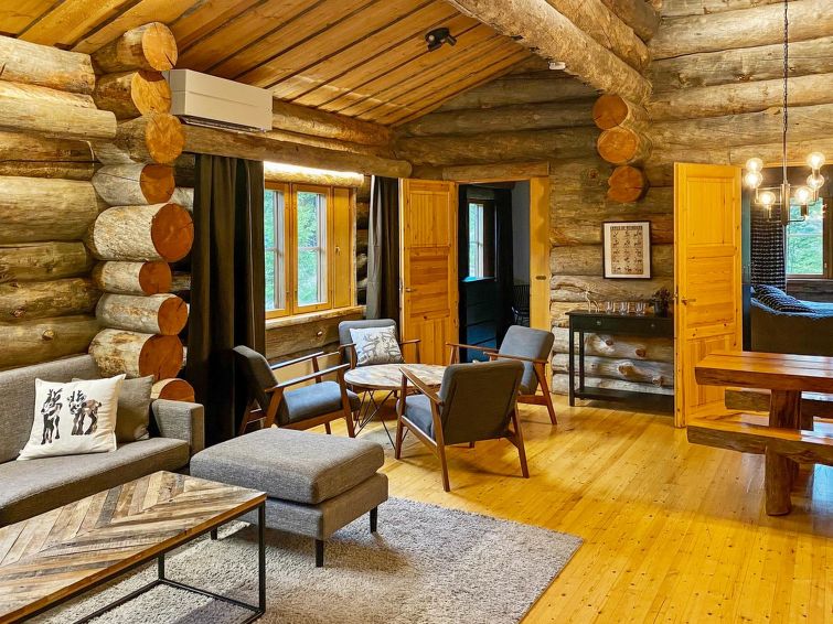 27 km to the north from Kuusamo, Ruka village (West-Ruka) 2.5 km. Log house apartment built in 1987, refurnished in spring 2021, bedroom 1-2: double bed, bedroom 3: 2 bunk beds. A shallow loft with steep stairs: 2 beds. Fully equipped Kitchen including filter coffee and "Dolce Gusto " capsule machine. Electric sauna, 2 showers. Rear terrace with table and chairs.