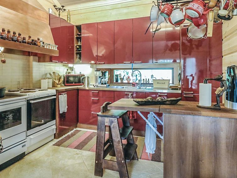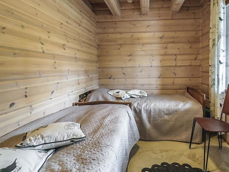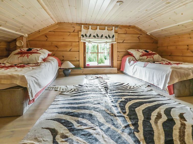 There is kitchen/living room, bedroom with wide double bed, bedroom with two 90 cm wide single beds, two 120 cm wide thick mattresses on the loft (the height of the loft is 140 cm, stable stairs leads to the loft), sauna, washroom, WC in the cabin. Air source heat pump (can be used for both warming and cooling).