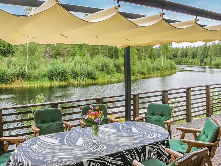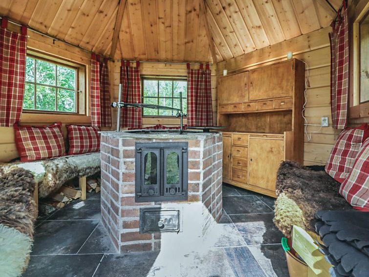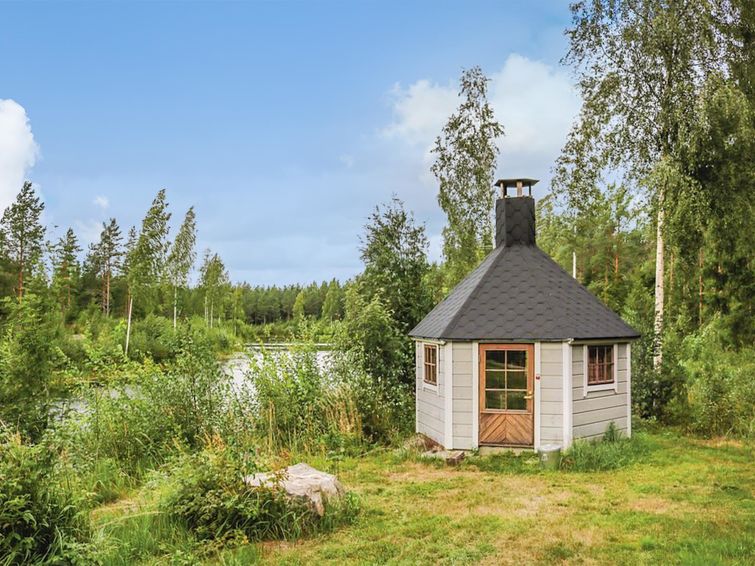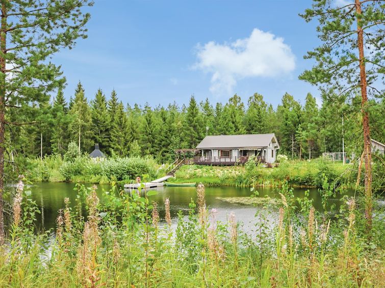 Log cabin in a really nice and calm location, on the shore of the pond. At this destination you can enjoy your holiday in peace. The nearest neighbor is about 500 m away. In addition to own peace, the cabin has amenities like cooking hut in the yard, spacious terrace, rowing boat and canoe.