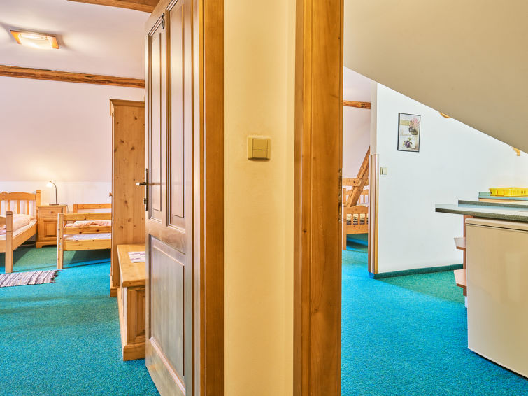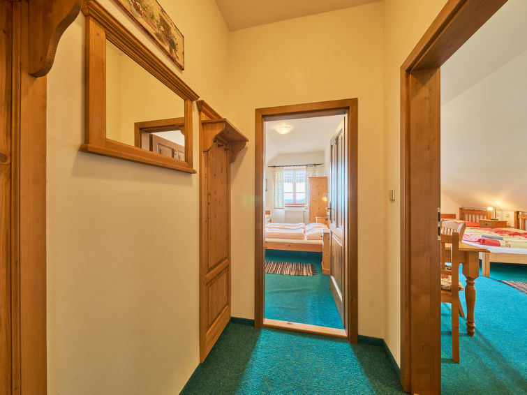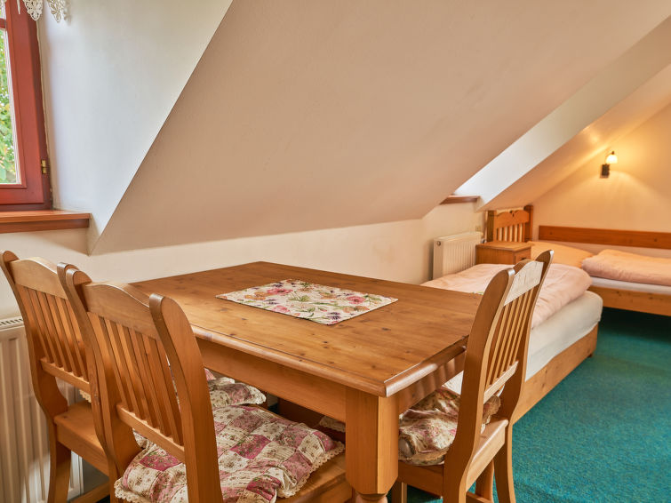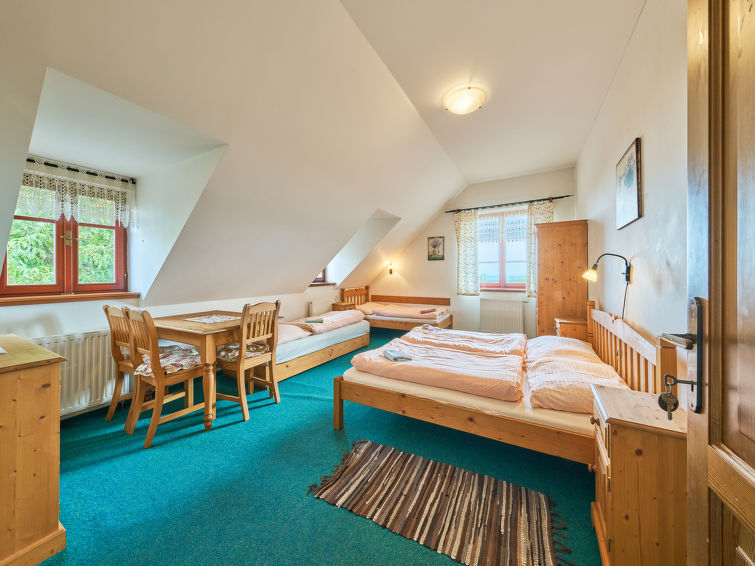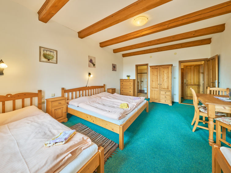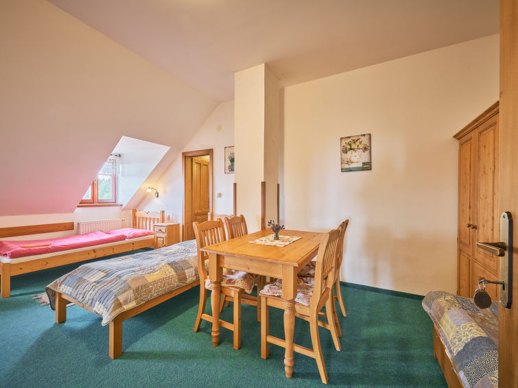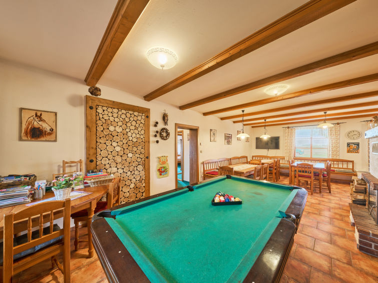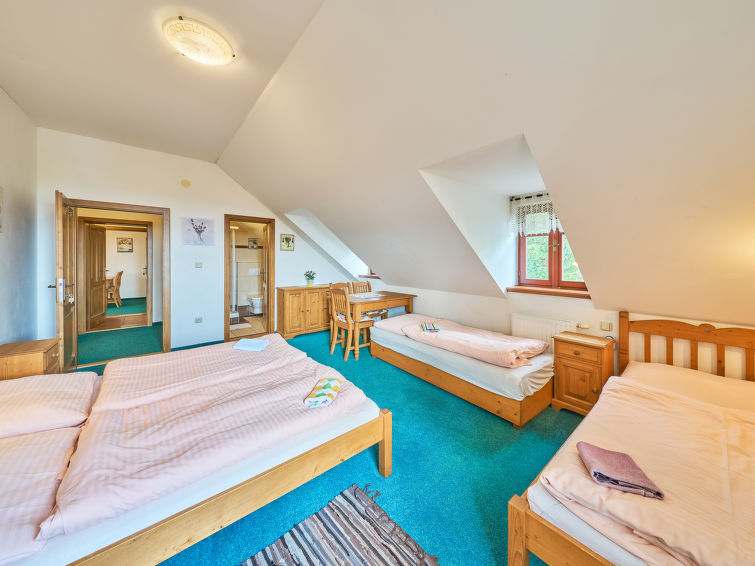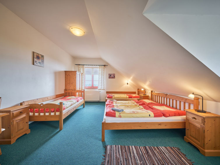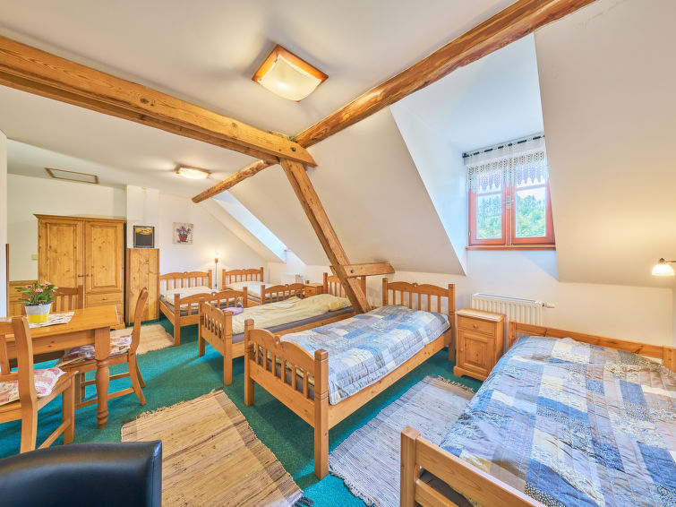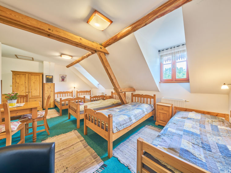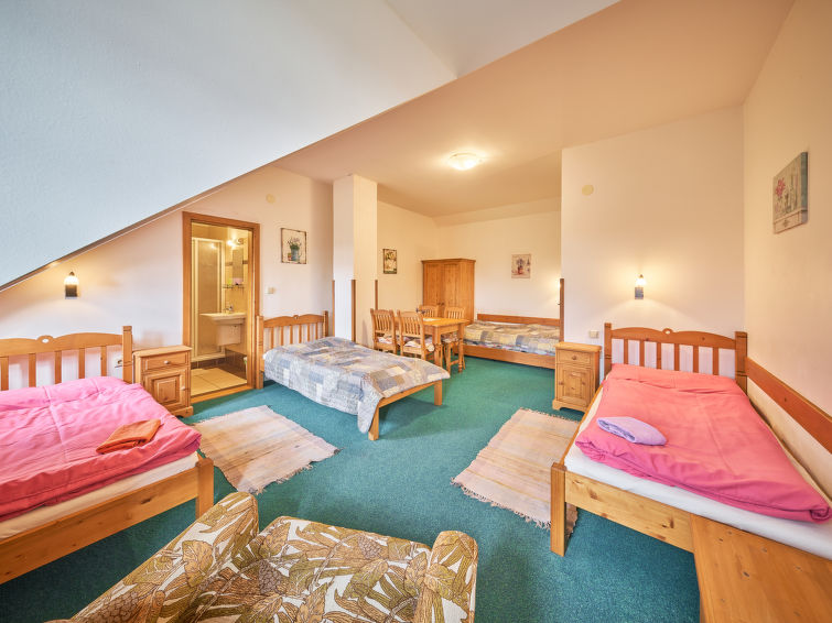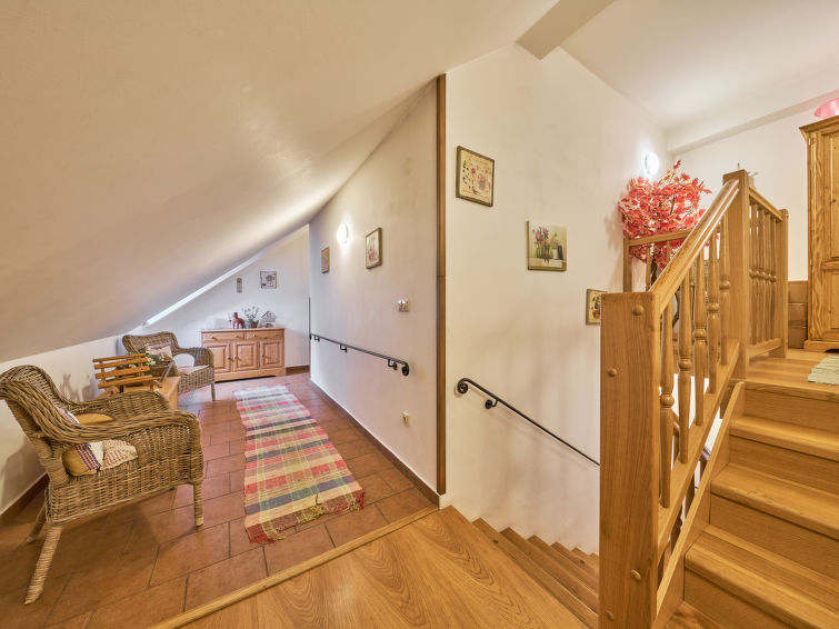 8 rom hus 330 m2 på 2 etasjer. Lys, stilfullt og træ møblement møbler: 1 rom med 1 seng, 1 dobbeltseng og dusj/WC. 1 rom med 2 senger, 1 dobbeltseng og dusj/WC. Kjøkken/stue (4 kokeplater, stekeovn, oppvaskmaskin, brødrister, vannkoker, mikrobølgeovn, frys, elektrisk kaffemaskin) med, vedovn, spisebord, spisehjørne, satelit-TV, CD-spiller og elektrisk oppvarming. El-oppvarming. Toppetasje: 1 rom med skråtak med 1 seng, 1 dobbeltseng og dusj/WC. 1 rom med skråtak med 1 seng, 1 dobbeltseng og dusj/WC. 1 rom med skråtak med 1 seng, 1 dobbeltseng, kjøkkenhjørne og dusj/WC. 1 rom med skråtak med 4 senger og dusj/WC. 1 rom med skråtak med 2 senger, 1 dobbeltseng, kjøkkenhjørne og dusj/WC. Terrasse. Terrassemøbler, grill (flyttbar). Hærlig panoramautsikt av dalen. Fasiliteter: høy barnestol barneseng (ekstra). Internett (trådløs LAN [WLAN], gratis). Vennligst merk: velegnet for familier. Røykfritt hus. Kjæledyr/små hunder tillatt 2 kjæledyr/små hunder tillatt.