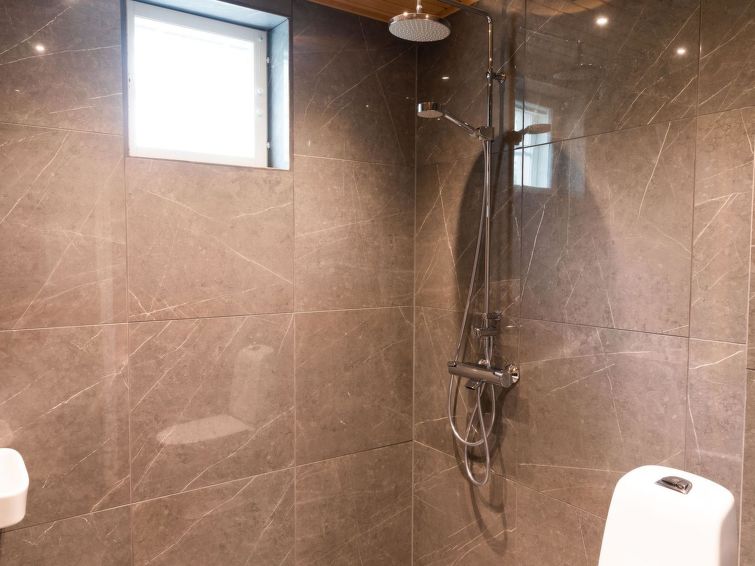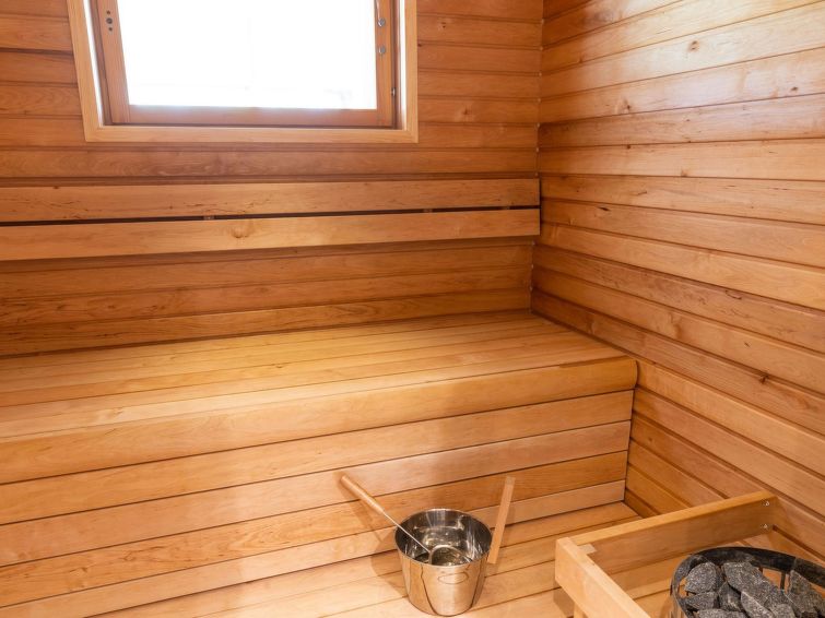 Wooden villa, built in 2022. Living room/kitchen, two bedrooms, both with two beds, sauna, washroom/WC, utility room, separate WC and covered terrace.