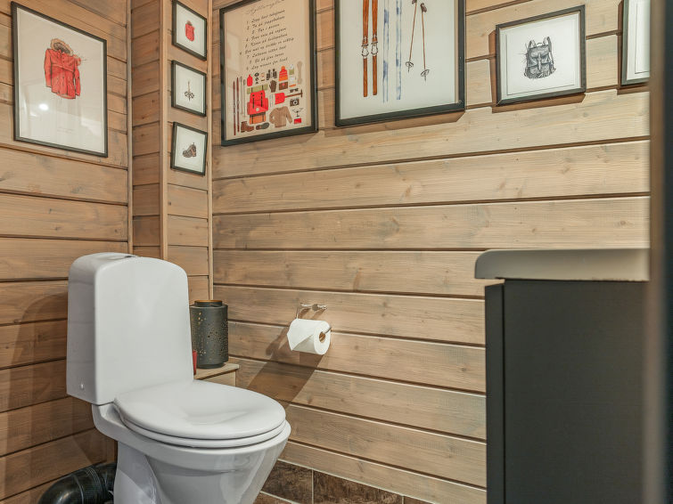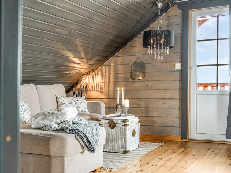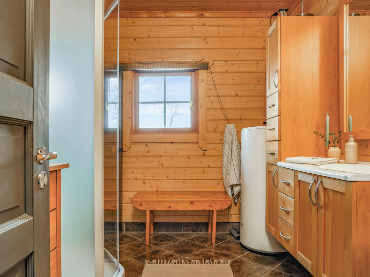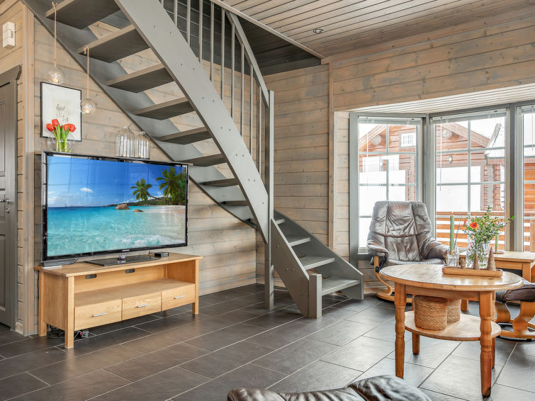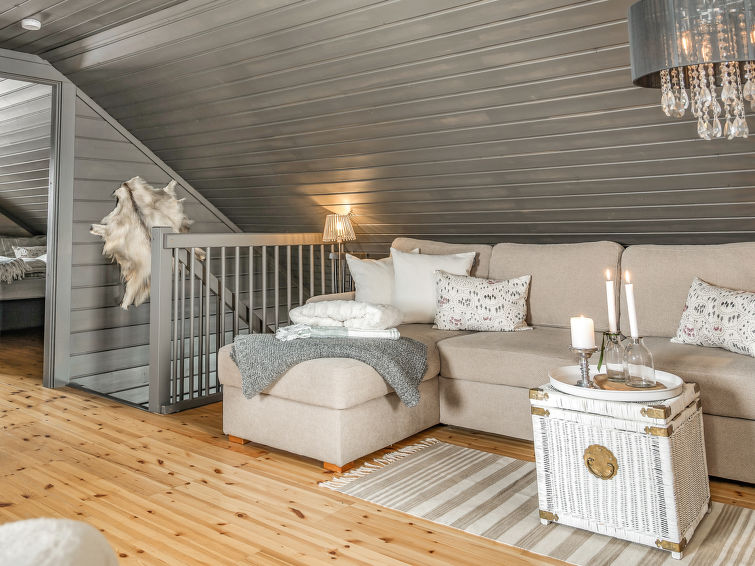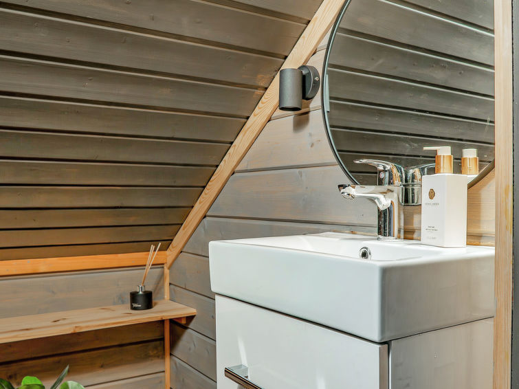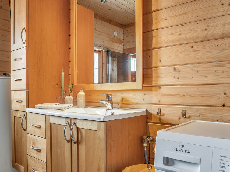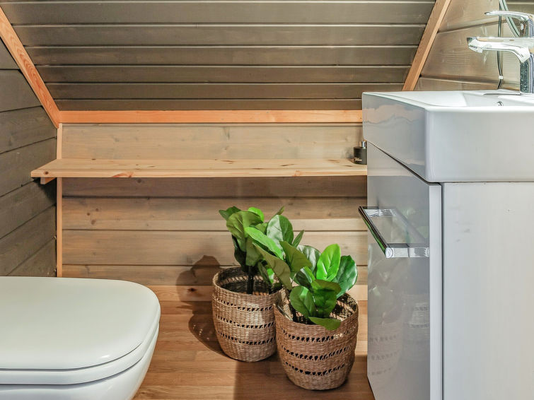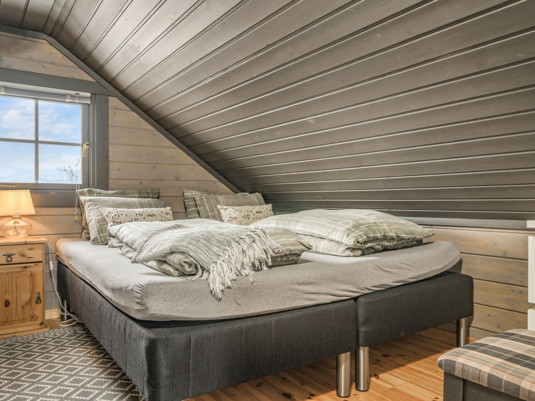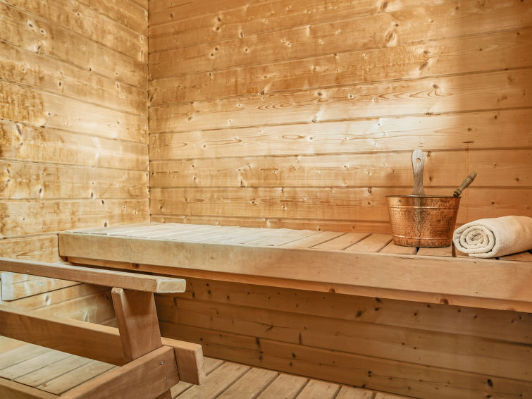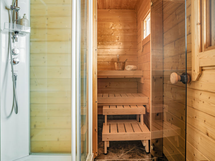 On the ground floor, living room/kitchen, bedroom with double bed, sauna, washroom, separate WC.
