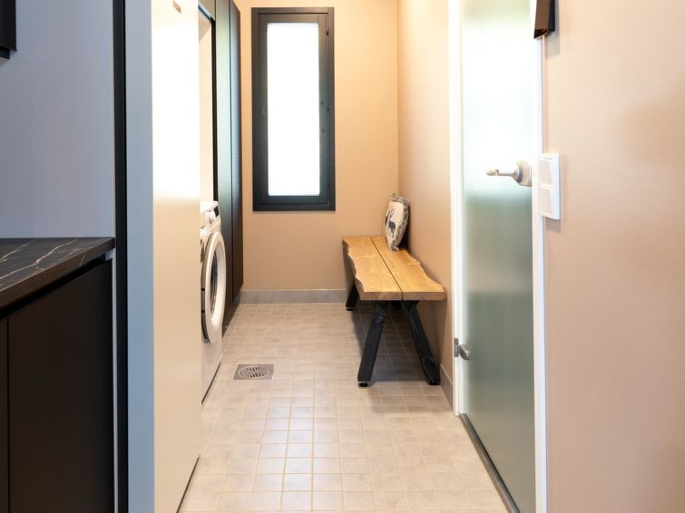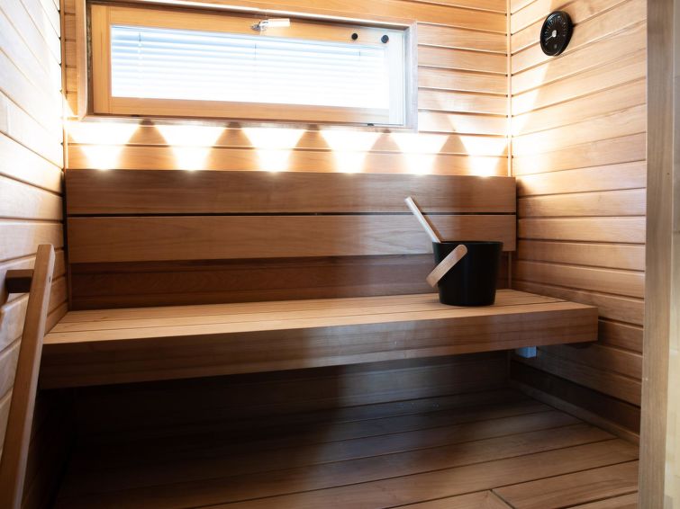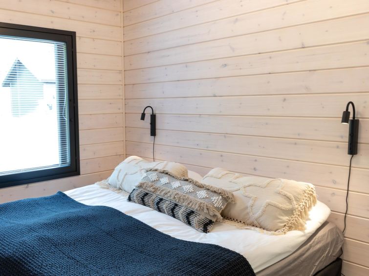 This wooden cabin, built in 2023, has living room/kitchen, bedroom with double bed, and two other bedrooms, each with two single beds, sauna, washroom with shower/WC, additional separate WC, utility room, lobby and terrace.