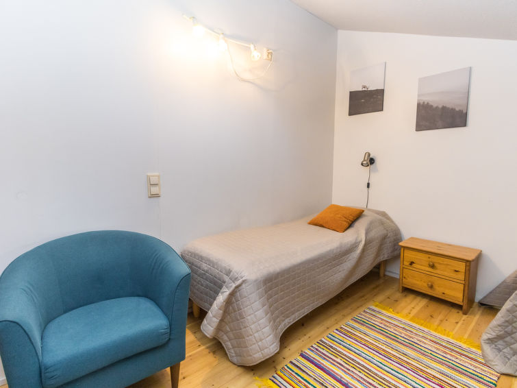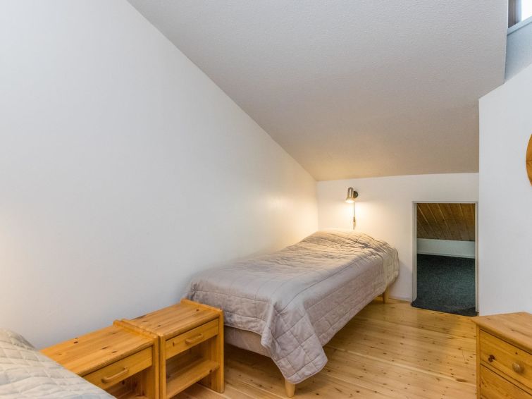 The ground floor bedroom has a double bed (double bed) and the two upstairs bedrooms each have two single beds.