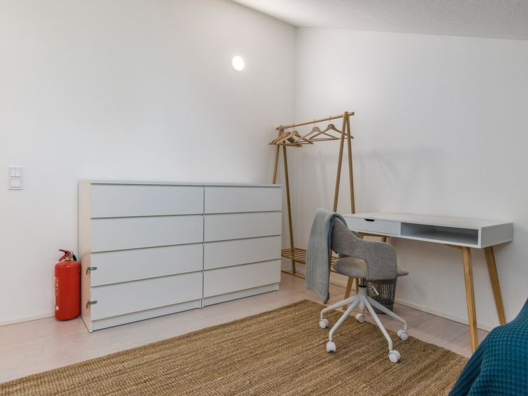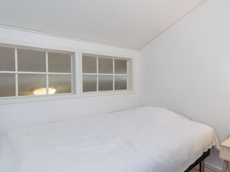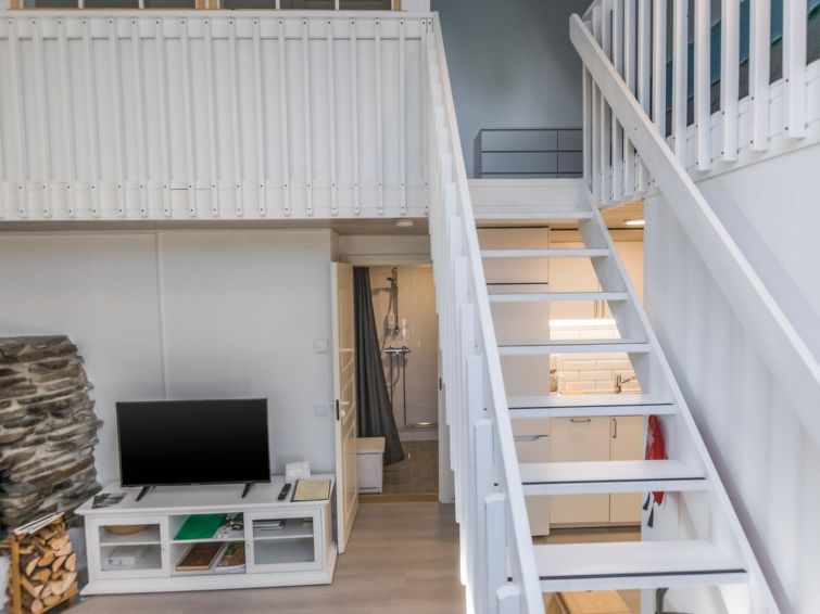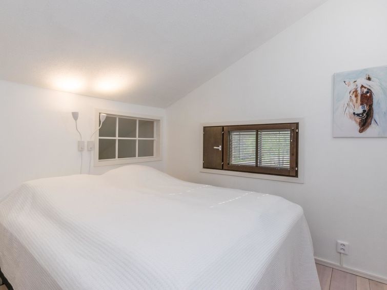 The bedroom on the ground floor has two beds. One upstairs bedroom has a 160 cm wide double bed and the other bedroom has a 120 cm wide bed. Both bedrooms have an open window without glass to the downstairs living room. In the open loft there is additional sleeping space for a 120 cm wide bed.