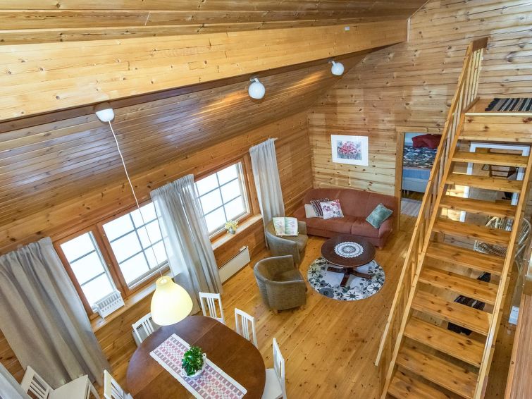 On the upper floor, there is a bedroom (11 m²) with two beds. In the open loft, there are two additional sleeping places available by using spreadable bed, balcony.
