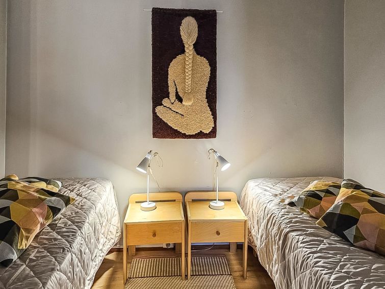 The windowless bedroom, closed by a French door, has two 80 cm wide frame mattress beds. The living room also has a 135 cm wide sofa bed with a spring mattress.