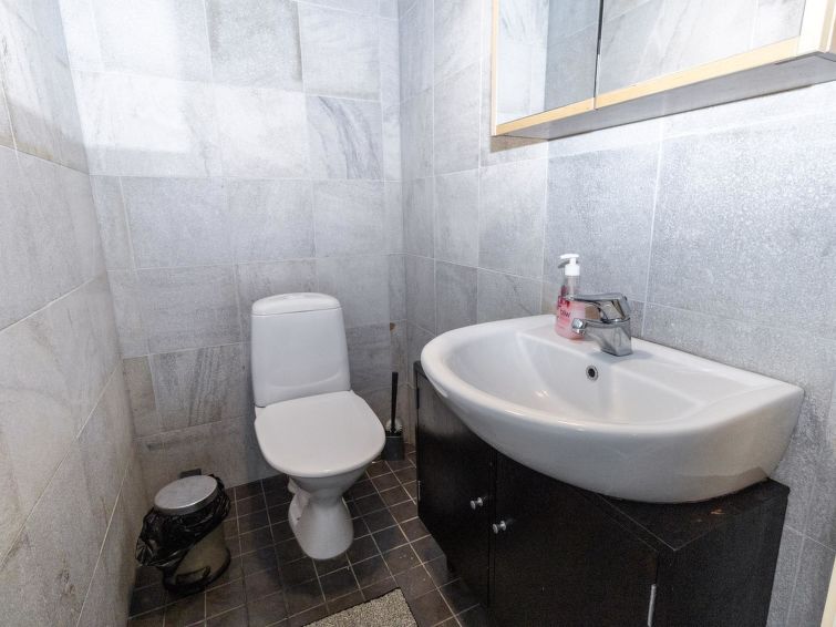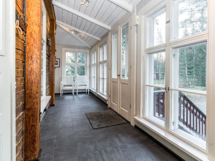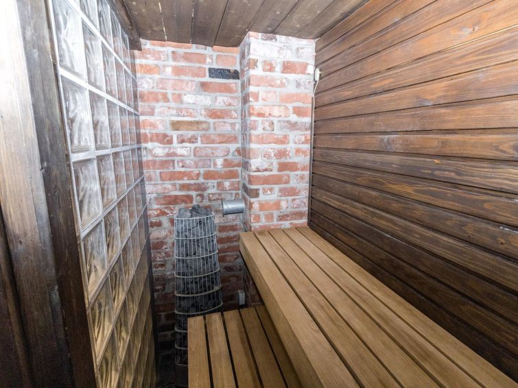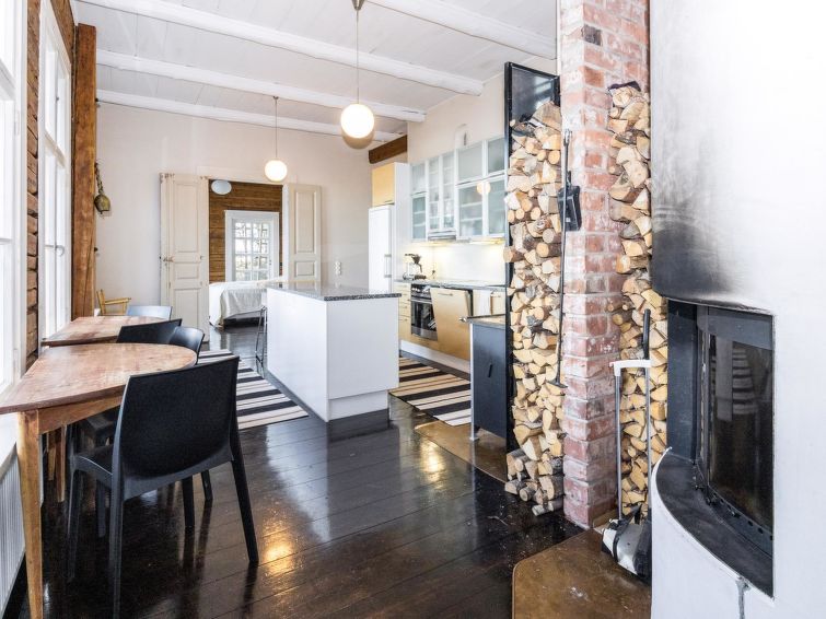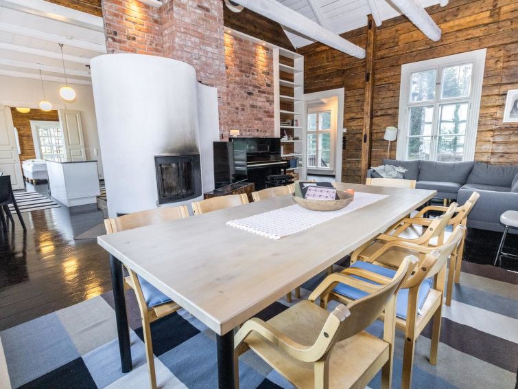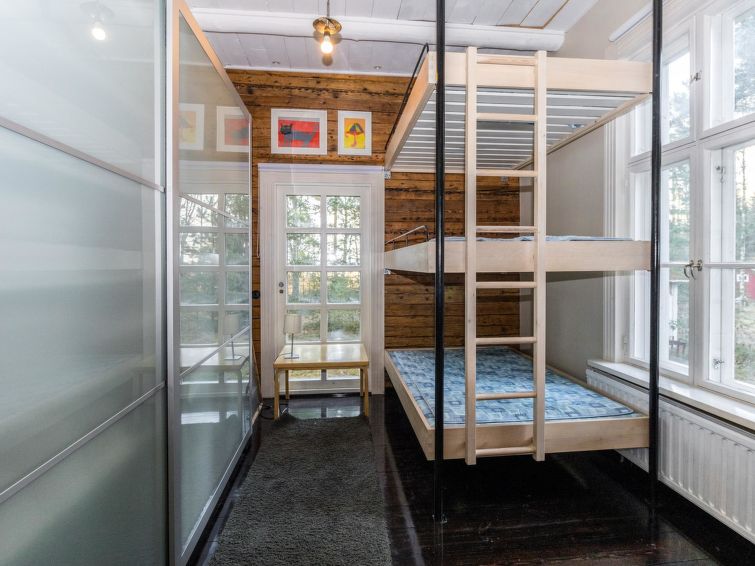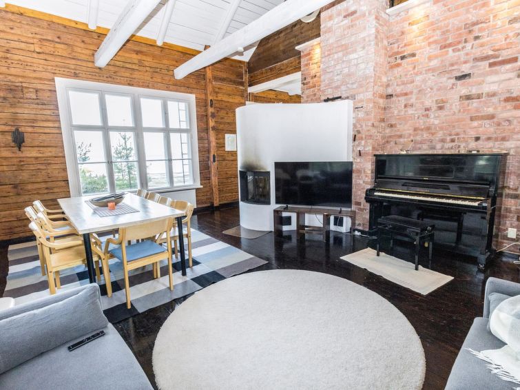 13 km south-west of Oulu, Bothnian Bay/Kempeleenlahti area 50 m, shallow shore, hard sand bottom, no boat. Log chalet, log house built in 1890 and moved to present location in 2009, equipped with modern conveniences, large living room, kitchen, bedroom double bed (width 180 cm), bedroom bunk with three levels (width 120 cm), 2 movable extra beds (mattresses) for children, sauna (electric stove), washroom, separate WC, glazed veranda. Chalet has geothermal heating and wireless 4G internet (Wifi) connection. Extra equipment includes wood-fired range-type stove, and piano. Fireplace is ‘open’ on two sides. Rented only for families or adult couples, not for youth groups. Spacious, comfortable log house with all conveniences. Many windows on the sea side. Sandy beach and shallow water ideal for children.