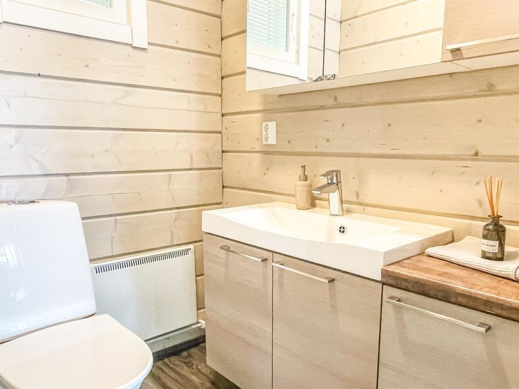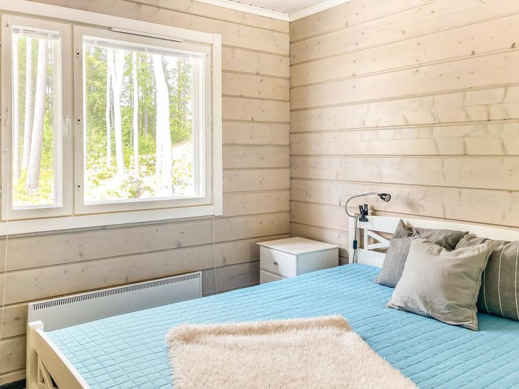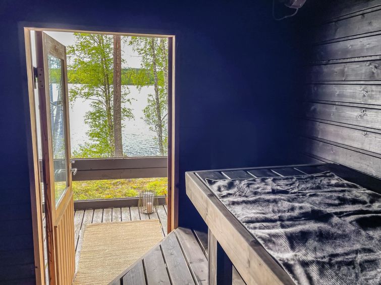 Wood-burning sauna stove in the lakeside sauna, two beds (available in summer) in the dressing room, and covered porch. You can ask the owner to rent an outboard motor for a rowing boat and a portable hot tub for bathing. Hot tub is shared by four cabins, the price is 80 euros/day when brought to the place, 130 euros for the weekend. Payment in cash directly to the owner.