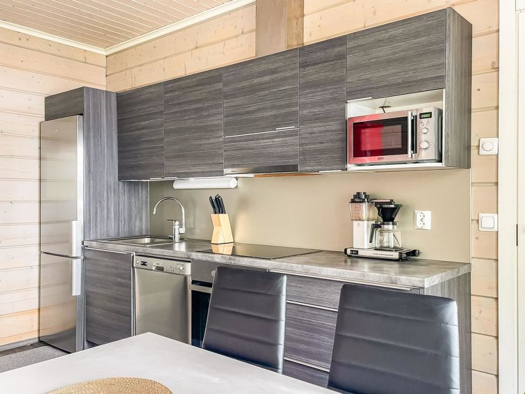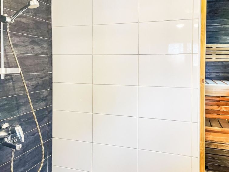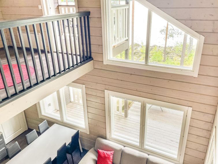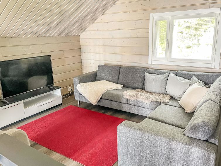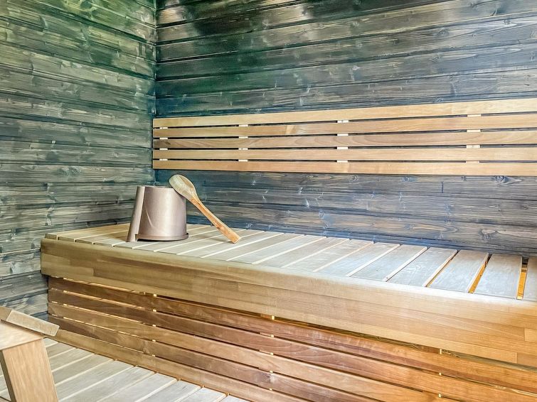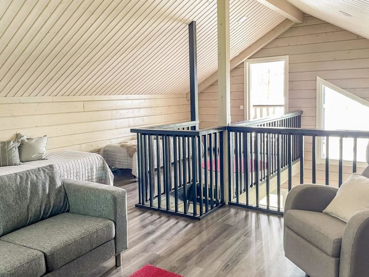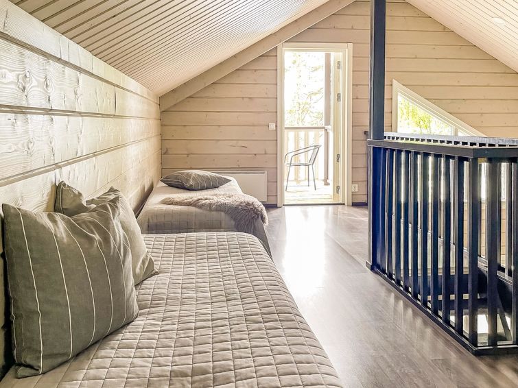 Well-equipped kitchen in the living room/kitchen, two bedrooms, both with double bed. Electric sauna stove in the sauna, shower in the washroom, dressing room, WC. Air source heat pump for cooling. On the upper floor, sofa, TV, and two beds. Balcony, covered terrace.