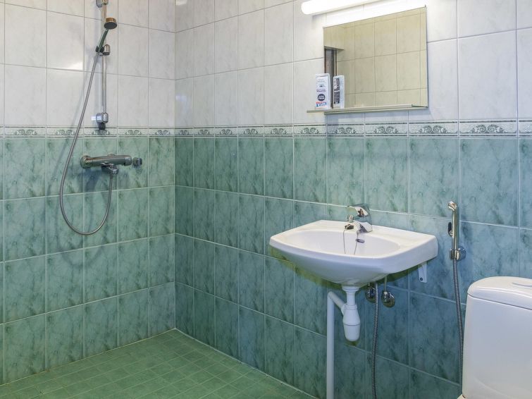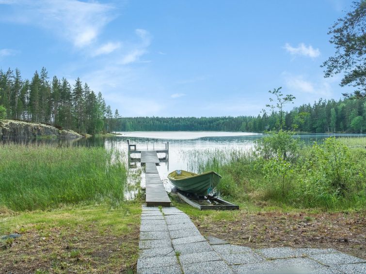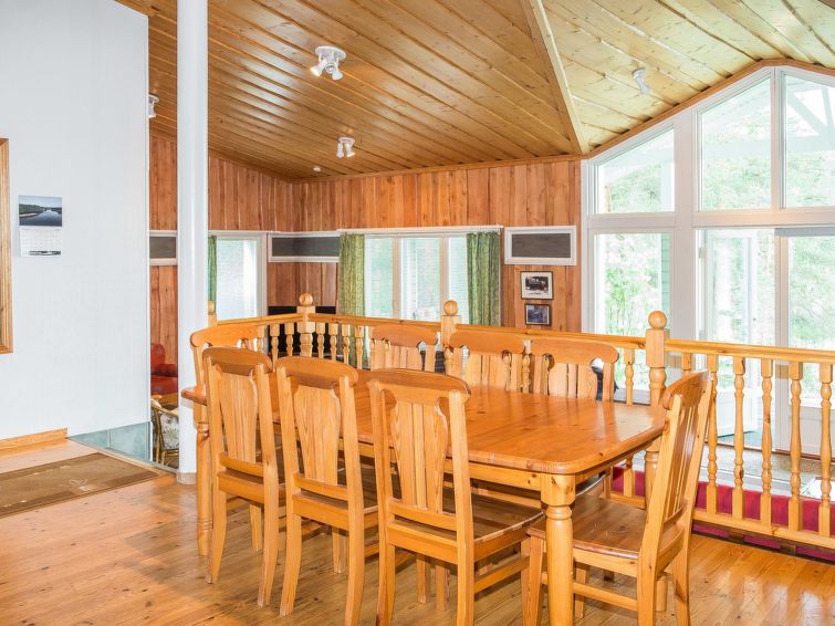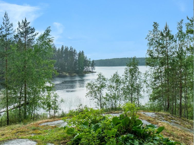 Separate sauna building with electric light, washroom and efficient wood-fired stove. Big villa on high and sunny rocky outcrop; steep steps down to shore along face of rock. In yard garage, storeroom, children’s sand box, and garden swings. Part of house has underfloor heating. Russian speaking person available.