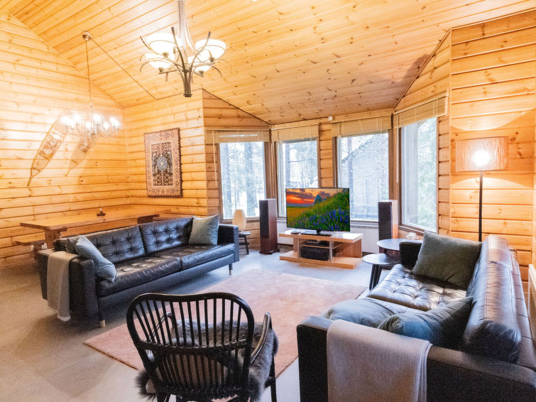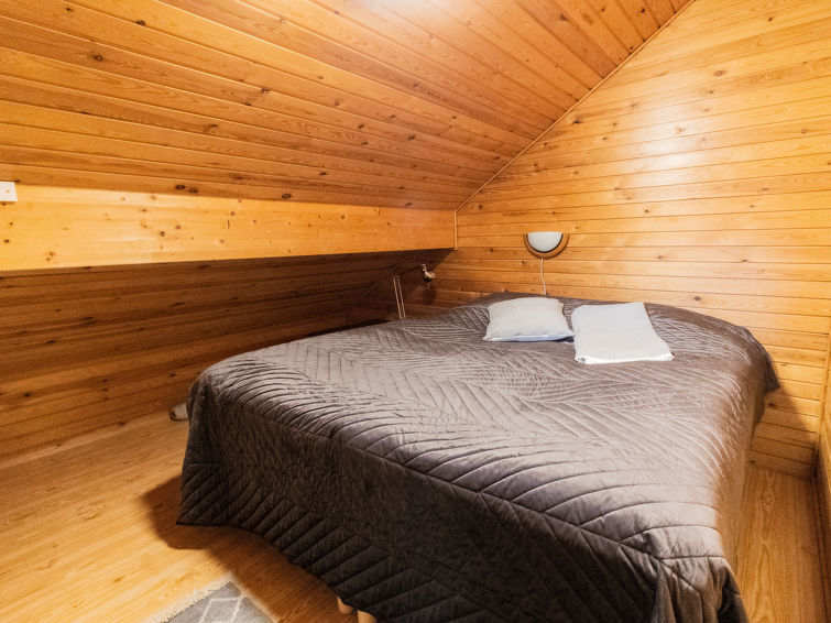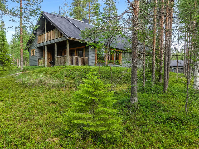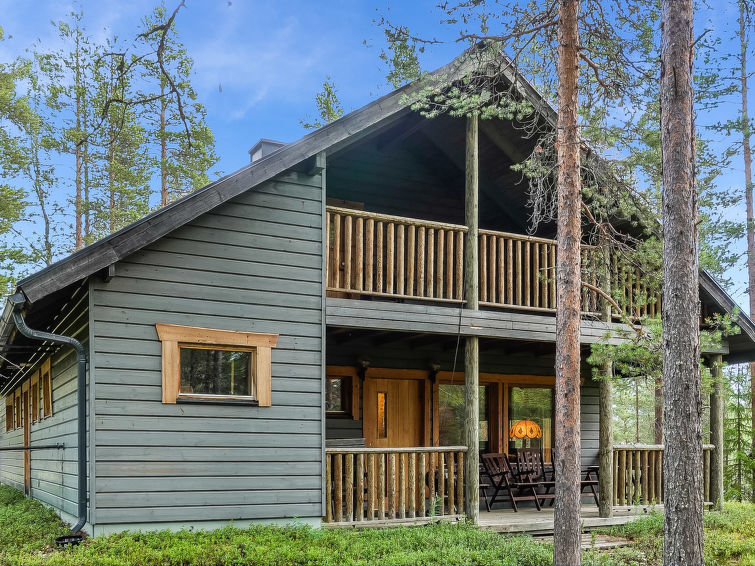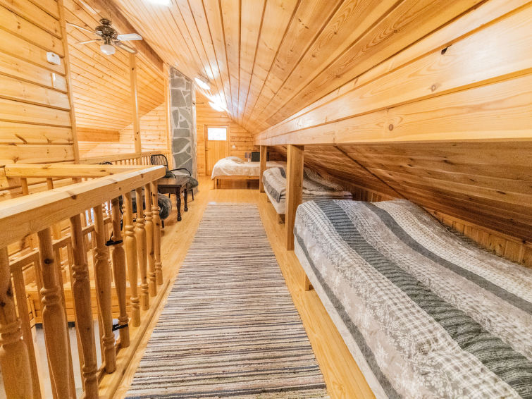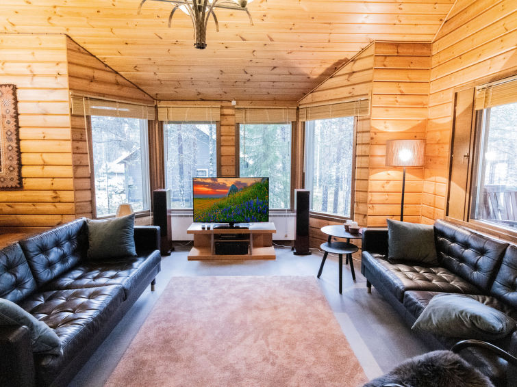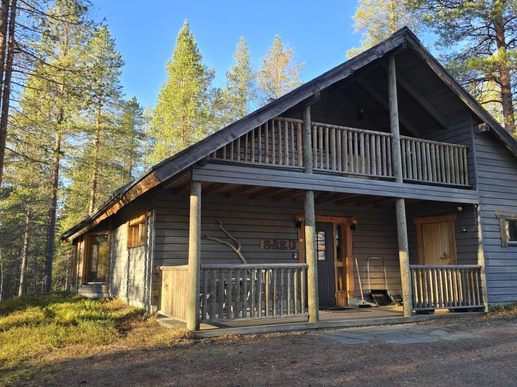 170 km north of Rovaniemi, in Levi Tourist Centre, Vähärakka area. Log panel cottage 1986. Downstairs: living room/kitchen, 2 bedrooms 2 beds in each, sauna (electric stove), washroom (2 showers), WC, 2 open porches. Upstairs: bedroom 2 beds, large sleeping loft 4 mattresses, 2 balconies. There are 2 TV sets and 2 DVD players in the cottage. Spacious chalet in peaceful location close to all Levi Tourist Centre services. Close to illuminated ski trail, snowmobile trail and skibus stop. Nearest slope is Levi Centre's Eturinne 1.7 km. Spa 1.9 km, Hullu Poro restaurant 1.3 km, golf course 3 km.