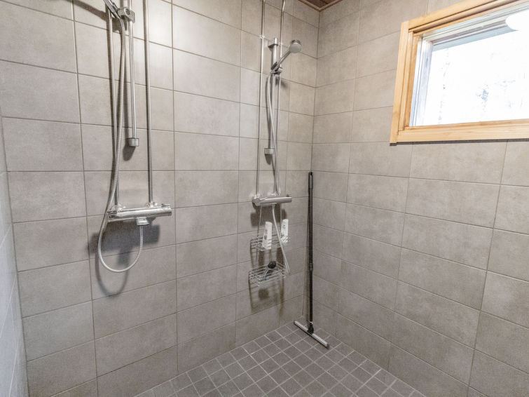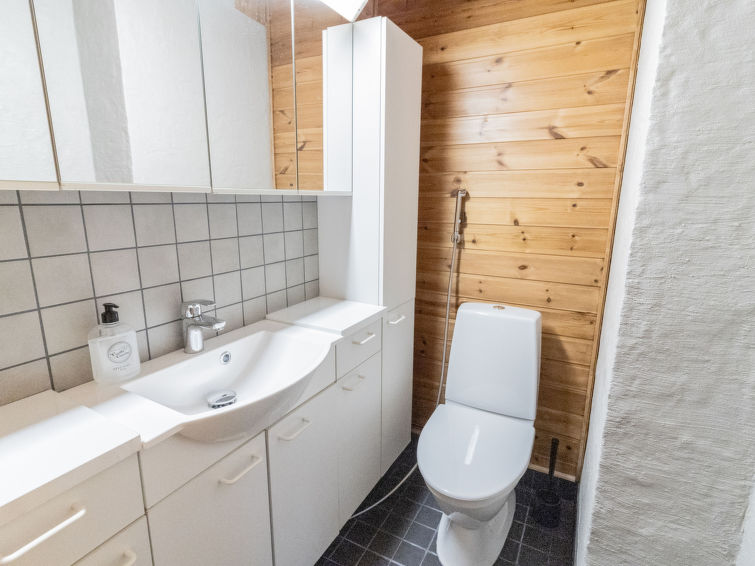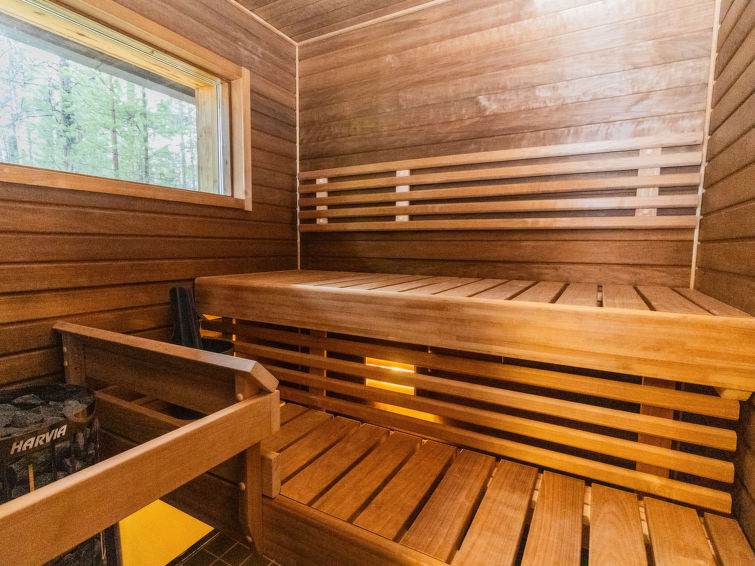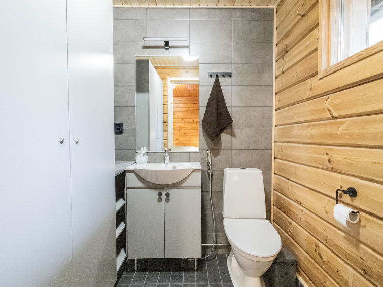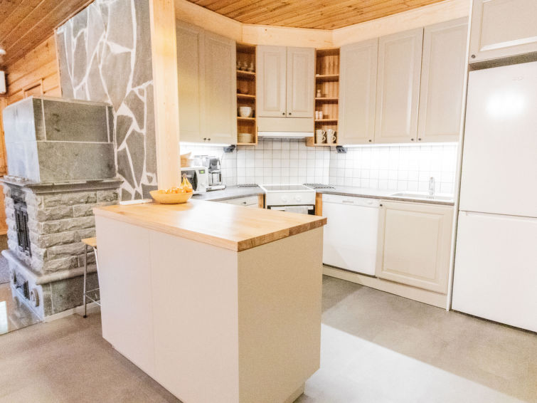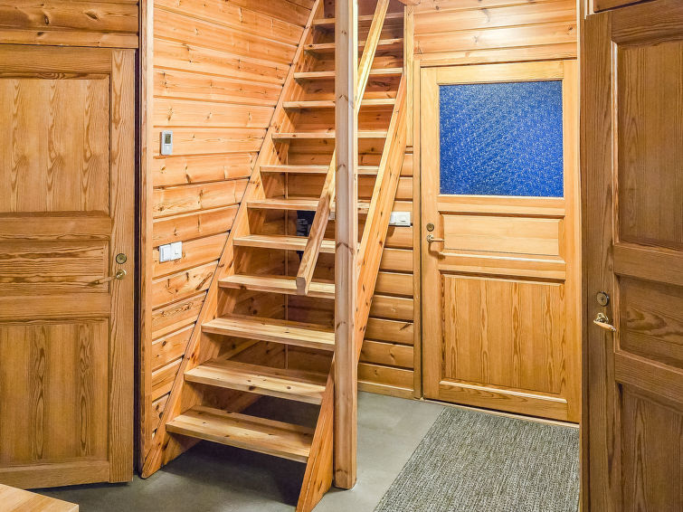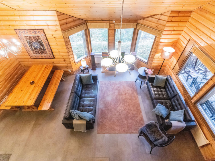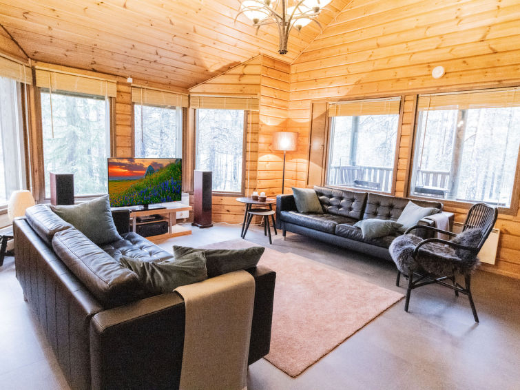170 km north of Rovaniemi, in Levi Tourist Centre, Vähärakka area. Log panel cottage 1986. Downstairs: living room/kitchen, 2 bedrooms 2 beds in each, sauna (electric stove), washroom (2 showers), WC, 2 open porches. Upstairs: bedroom 2 beds, large sleeping loft 4 mattresses, 2 balconies. There are 2 TV sets and 2 DVD players in the cottage. Spacious chalet in peaceful location close to all Levi Tourist Centre services. Close to illuminated ski trail, snowmobile trail and skibus stop. Nearest slope is Levi Centre's Eturinne 1.7 km. Spa 1.9 km, Hullu Poro restaurant 1.3 km, golf course 3 km.