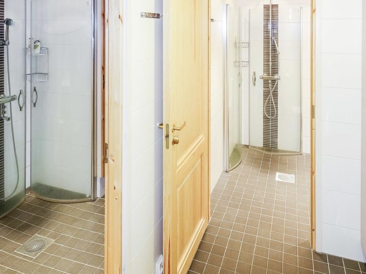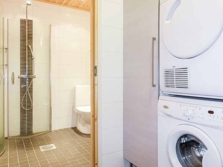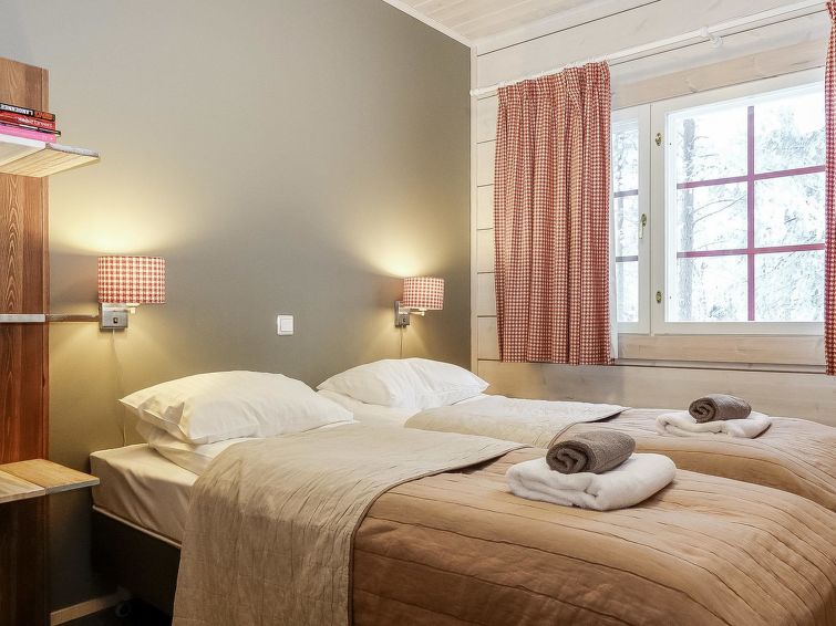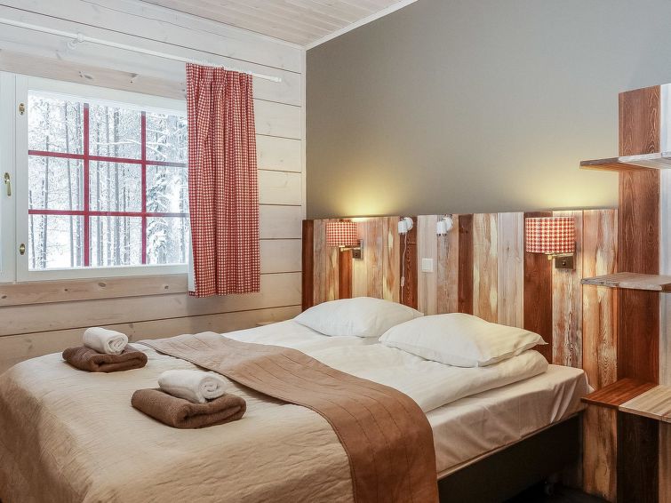 78 km east of Kemijärvi, in Sallatunturi holiday resort area. A log cabin apartment, built in 2011, in a house with 4 apartments. Kitchen-living room, 3 bedrooms each with 2 beds made already, shower room, electric sauna (renewed in 2023) stove), laundry room, 2 toilets (one with shower), hall, porch.