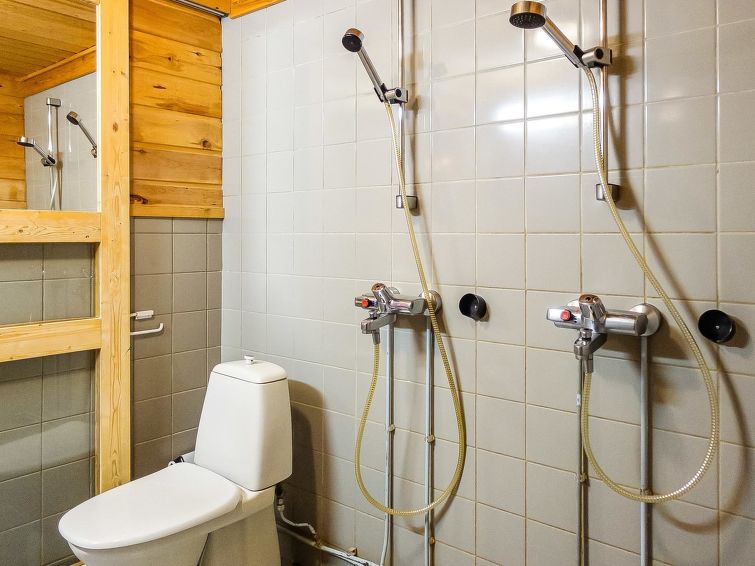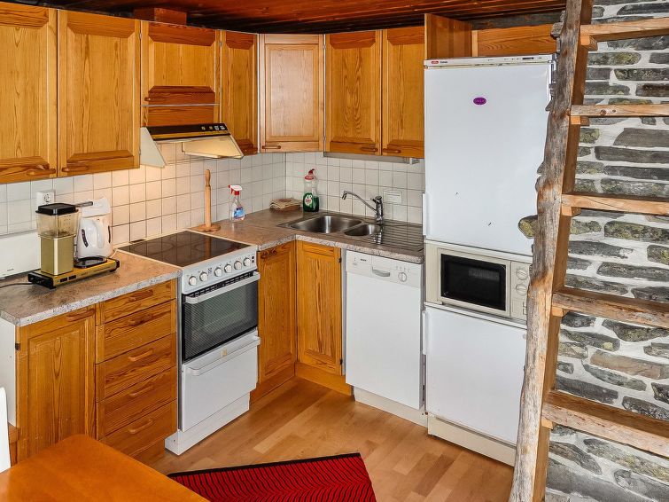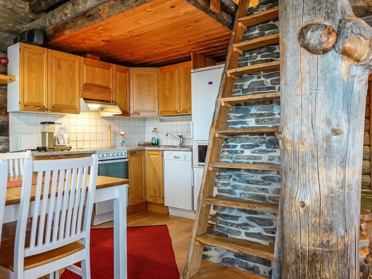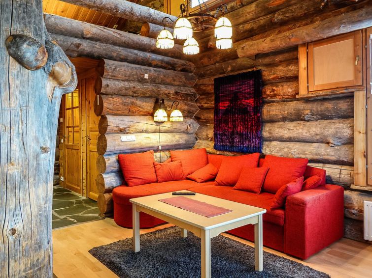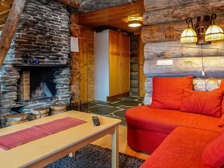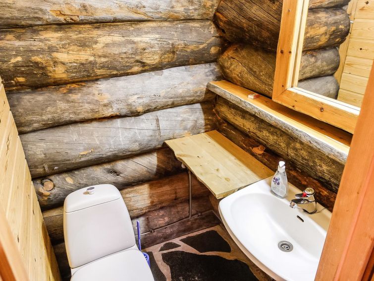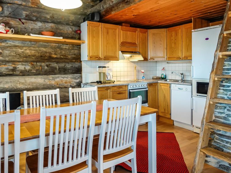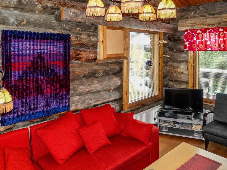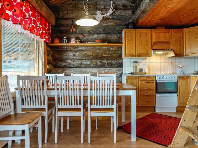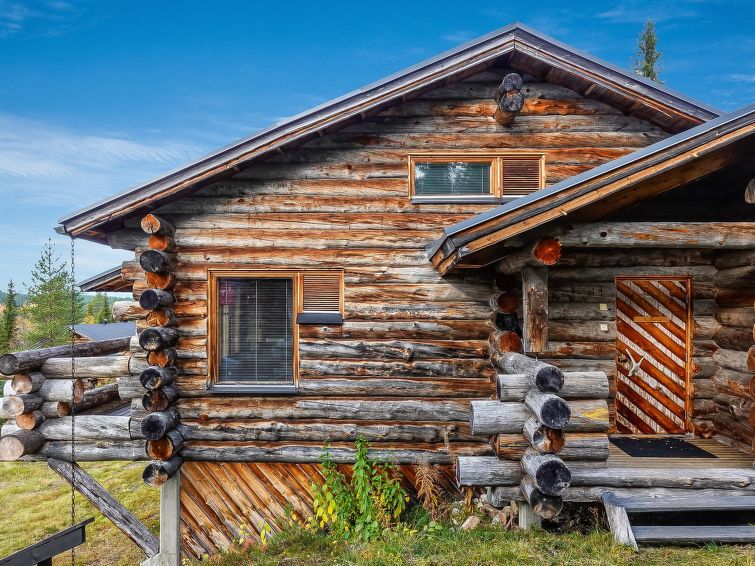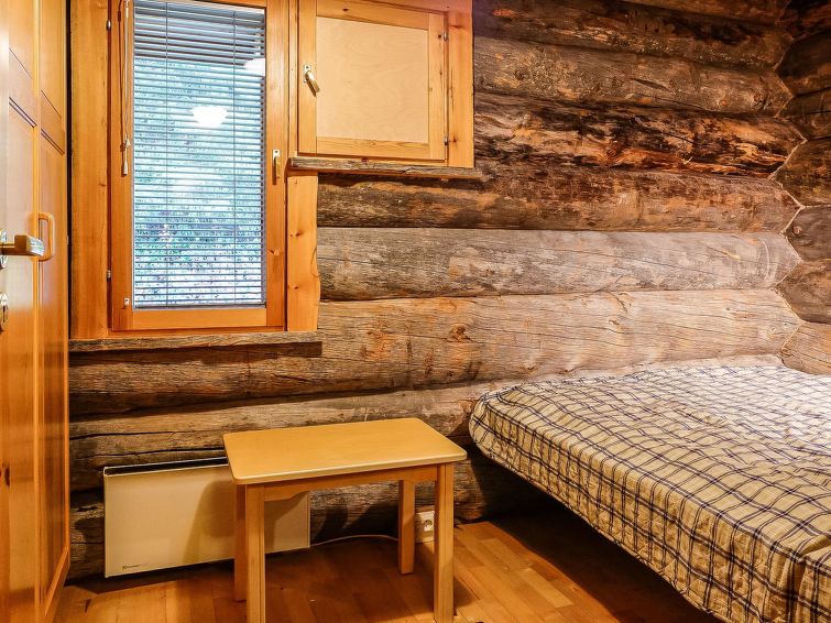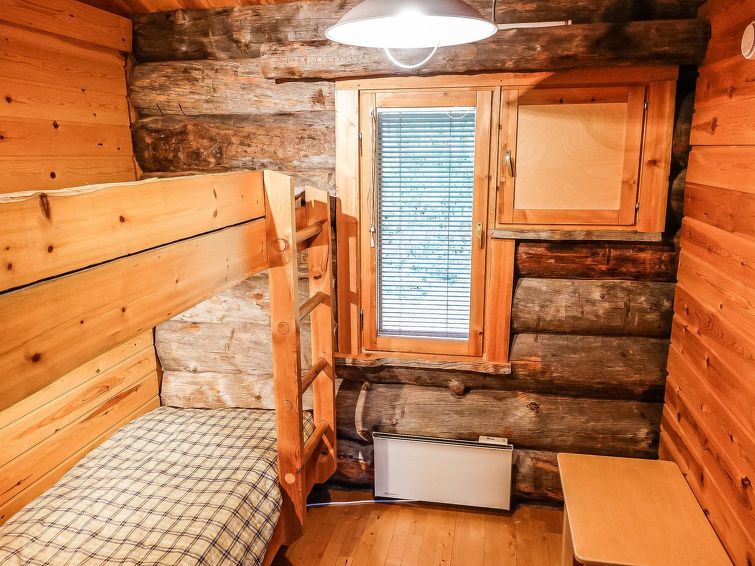 75 km to the east from Kemijärvi, in Sallatunturi tourist center, lake Keselmäjärvi 100 m (public beach, road between the cabin and the beach). Kelo log apartment in a semi-detached house, built in 1990, living room/kitchen, bedroom with double bed, another bedroom with bunk bed, loft with 2 beds (loft 20 m², steep stairs), sauna, washroom (2 showers and WC), separate toilet and balcony.