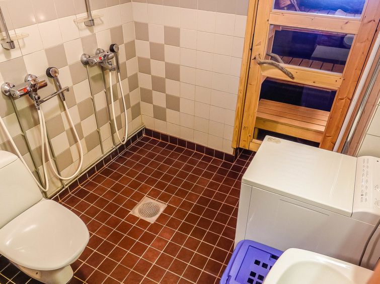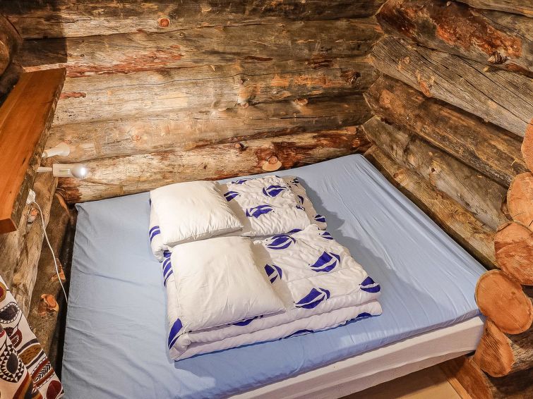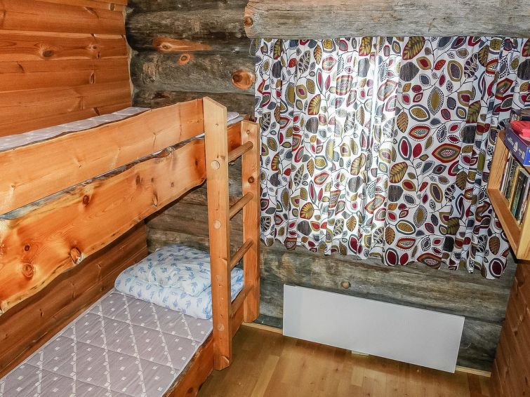 Kelo log apartment in semi-detached house, built in 1990, living room/kitchen, bedroom with double bed, another bedroom with bunk bed, loft with 2 beds (loft 20 m², steep stairs), sauna, washroom (2 showers and WC), separate toilet and balcony.