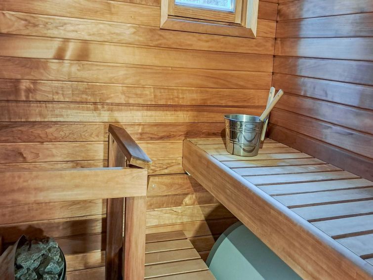 The apartment has living room with sofa bed, kitchenette, sauna, washroom and separate WC. The loft has a wall that divides it into two compartments. There are three beds in the first compartment and two beds in the another. The loft has a sloping ceiling.