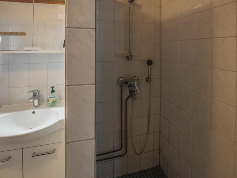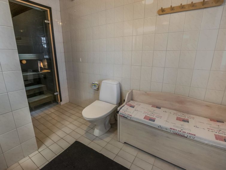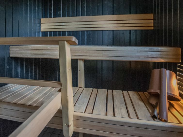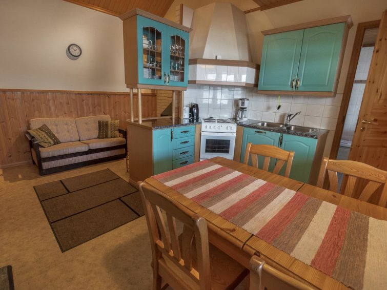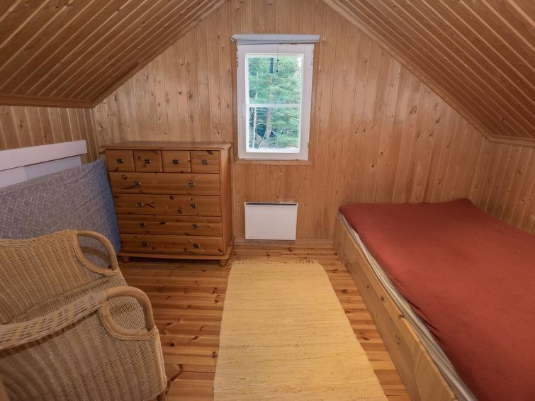 Wooden cabin 1999 in downstairs: living room/kitchen and terrace. In cottage upper floor: small bedroom (120 x 200 cm), sleeping alcove one double bed + cot, washroom, sauna (electric stove).