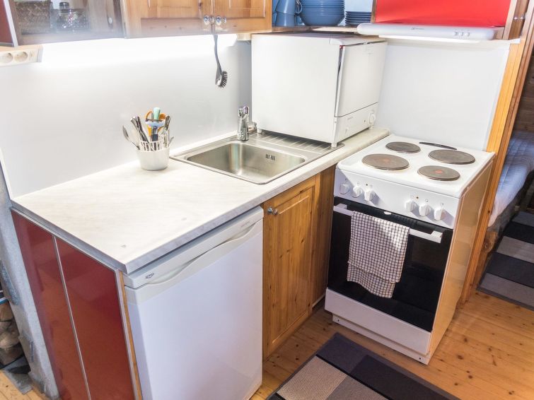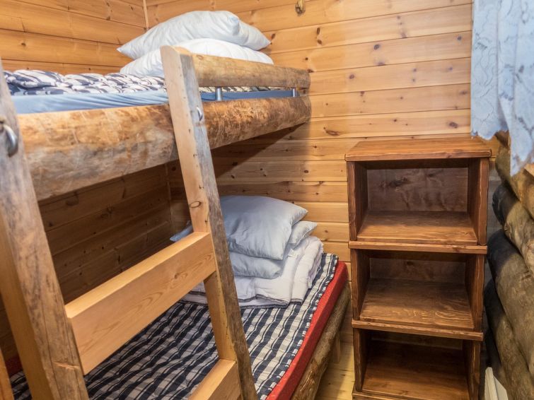25 km north of Kuusamo, Ruka 4 km, Lake Kesäjärvi 2 km. Apartment in log-built row house, built in 1988, small bedroom: bunk bed (length 185cm), loft (10 m²): 4 beds (steep stairs to the loft), combined kitchen/living room, electric sauna. Apartment in Saukkolampi area. Drying cupboard for clothes is in the warm outdoor storage.