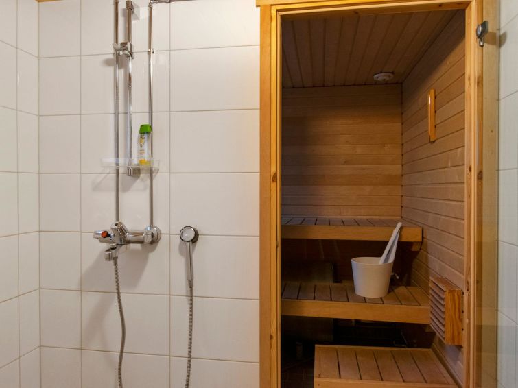 Log panel semi-detached house with living room/kitchen, downstairs bedroom with double bed 160cm wide, toilet, washroom and sauna (electric stove), upstairs 4 beds, open porch.