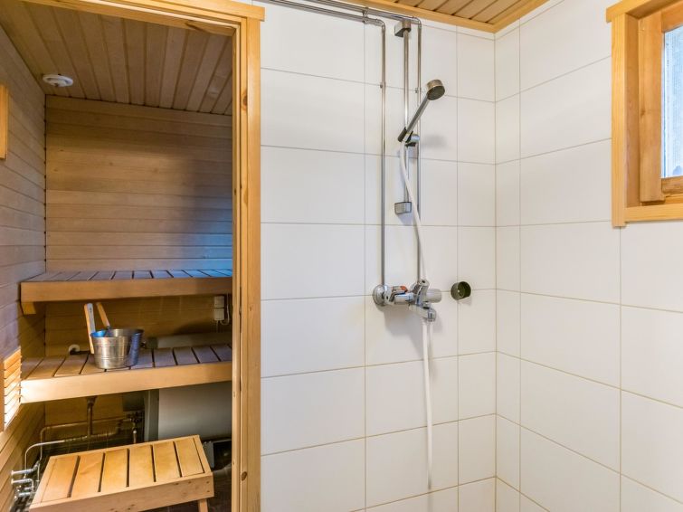Semi-detached house with living room/kitchen, downstairs bedroom with double bed 160cm wide, toilet, washroom and sauna (electric stove), upstairs 4 beds (80cm), open porch.