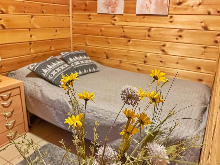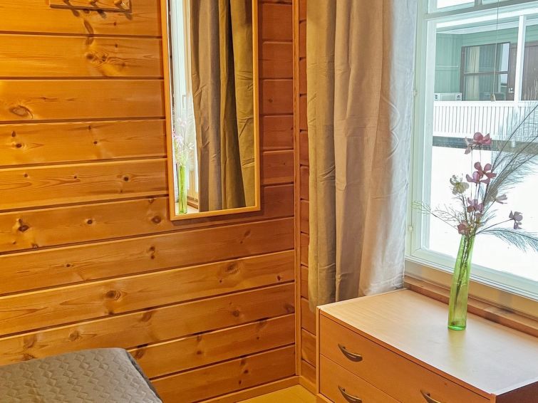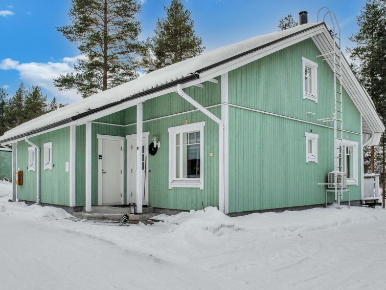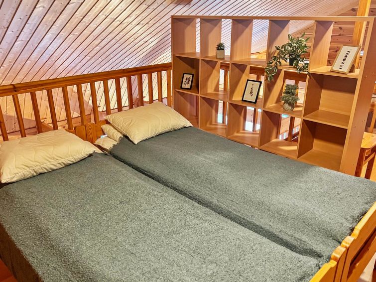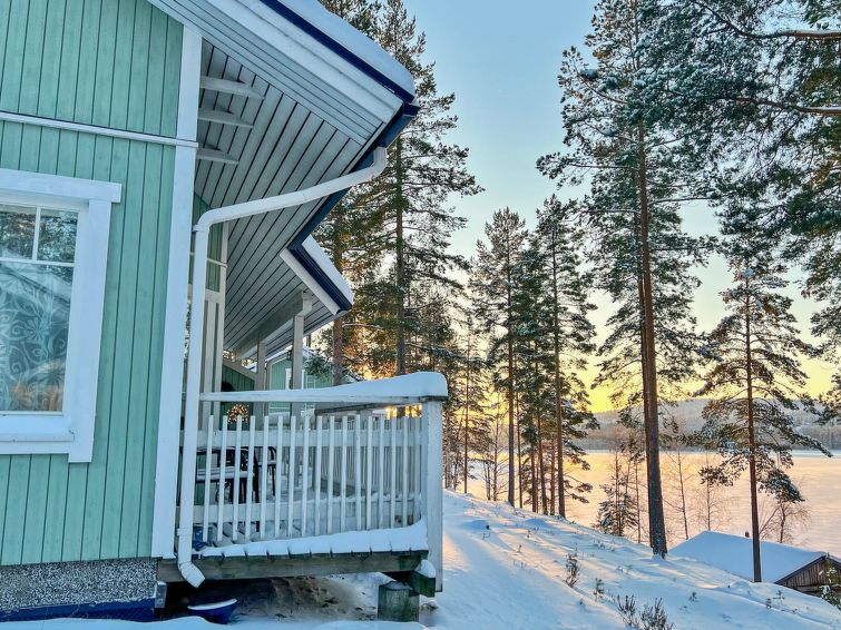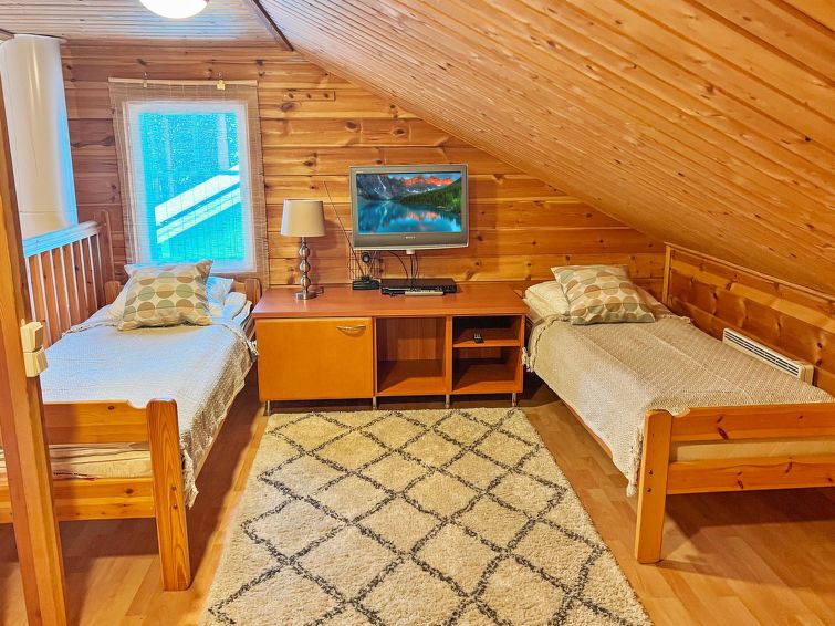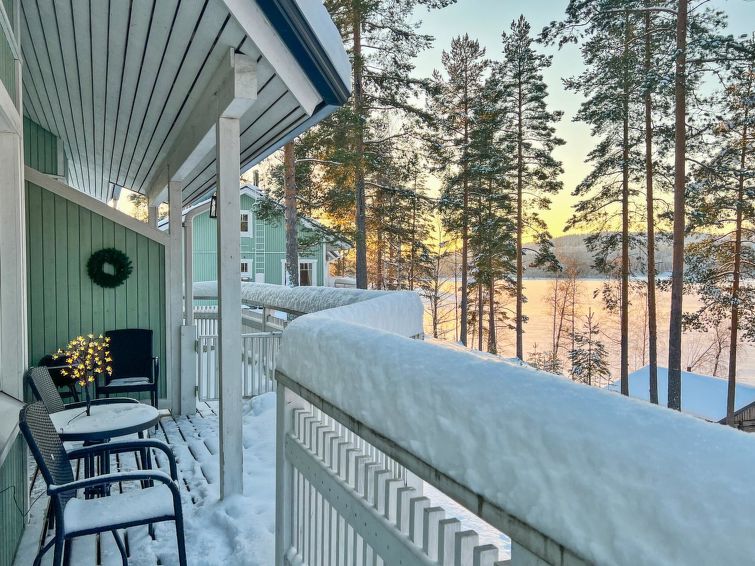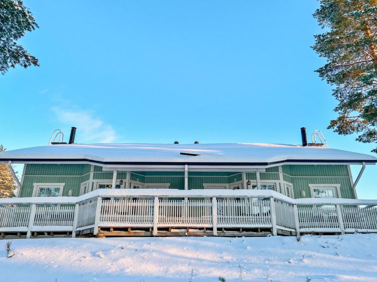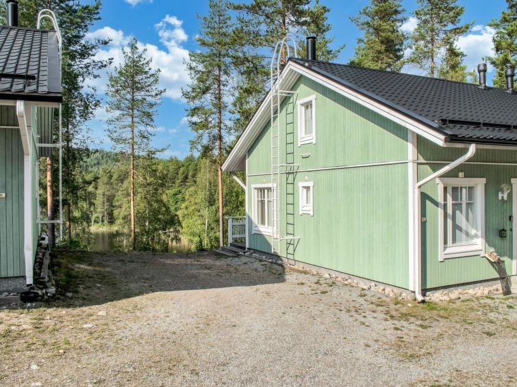 77 north of Joensuu, Pond Käränkälampi 50 m (length 2 km, width 1,5 km), common beach with shallow bottom 100 m, Wood semi-detached house 2005, kitchen-living room, small bedroom (with door, but no window) with 120 cm width double bed, bed room with 2 beds, sleeping gallery with four beds, washroom, sauna (elec. stove) and terrace. Wi-Fi 4 G. Semi-detached house apartment by pond Käränkälampi in Loma-Koli cottage area. The terrace offers a view on pond Käränkälampi. There is a tumble dryer and charcoal grill. One bicycle in store. Good possibilities for down hill and cross-country skiing; Ukko-Koli slopes 9 km.