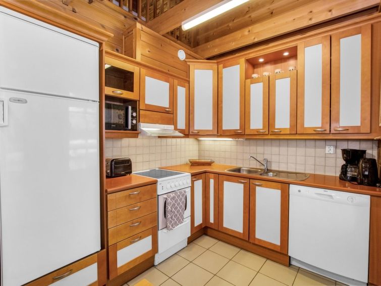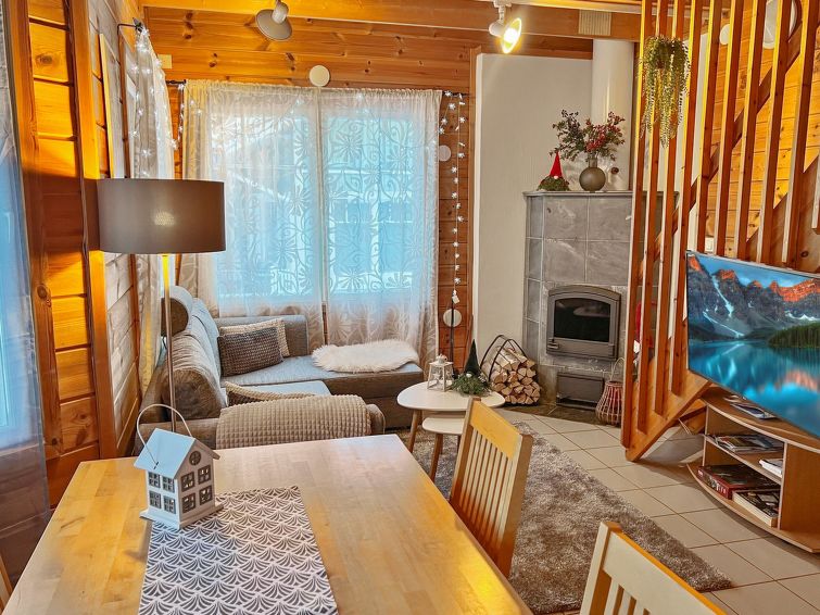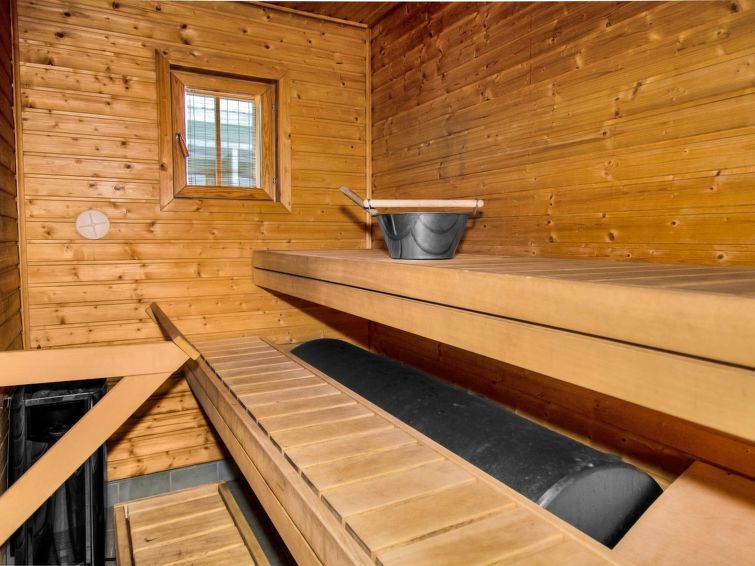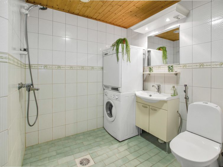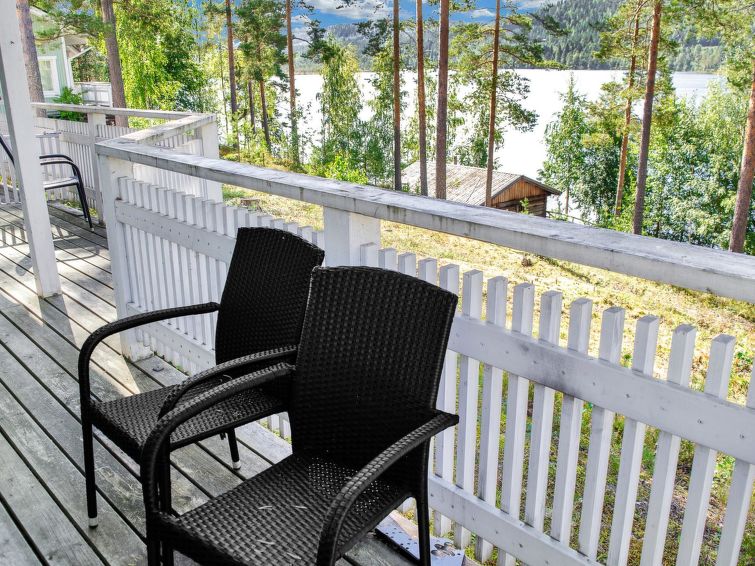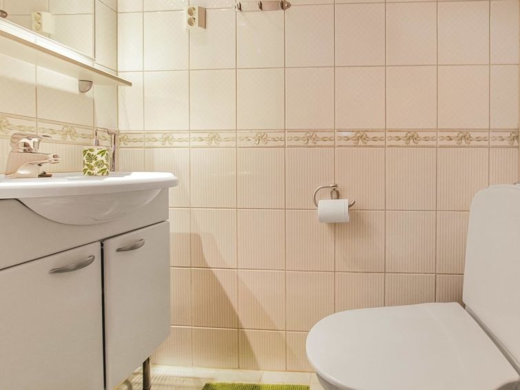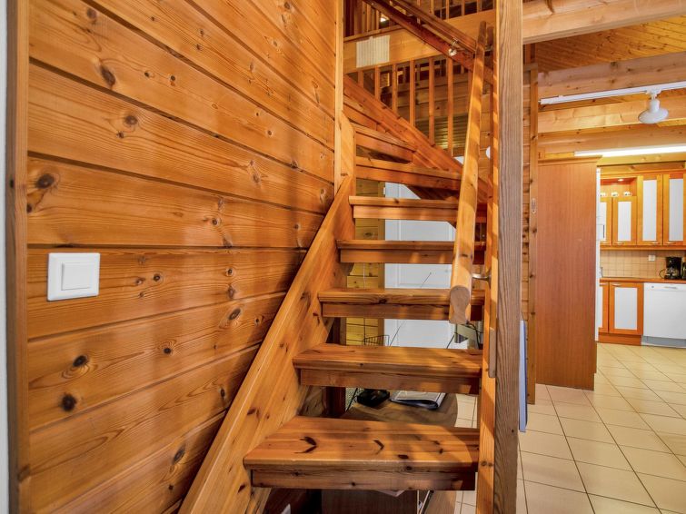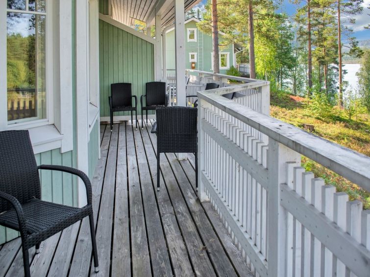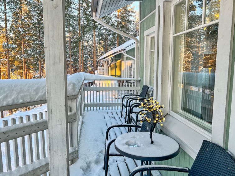 77 north of Joensuu, Pond Käränkälampi 50 m (length 2 km, width 1,5 km), common beach with shallow bottom 100 m, Wood semi-detached house 2005, kitchen-living room, small bedroom (with door, but no window) with 120 cm width double bed, bed room with 2 beds, sleeping gallery with four beds, washroom, sauna (elec. stove) and terrace. Wi-Fi 4 G. Semi-detached house apartment by pond Käränkälampi in Loma-Koli cottage area. The terrace offers a view on pond Käränkälampi. There is a tumble dryer and charcoal grill. One bicycle in store. Good possibilities for down hill and cross-country skiing; Ukko-Koli slopes 9 km.