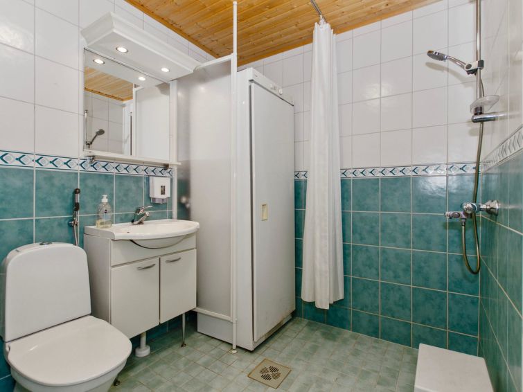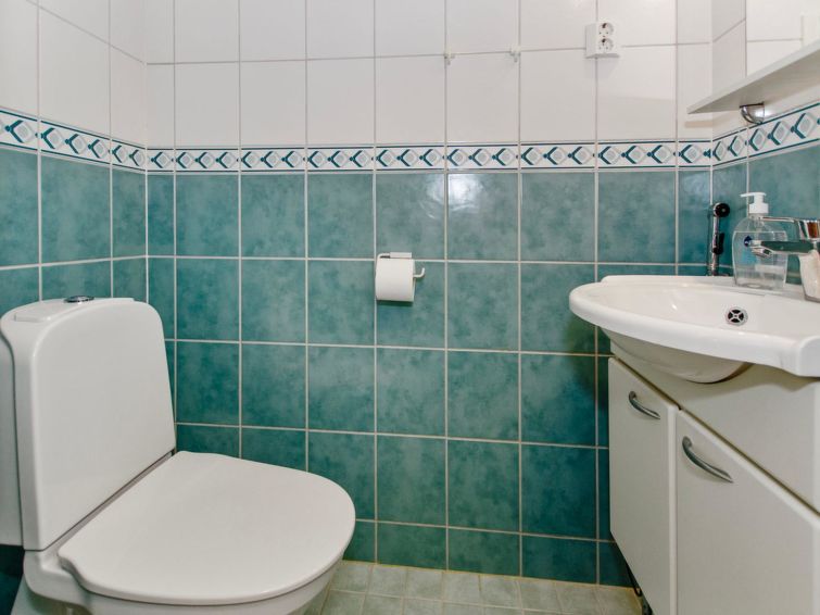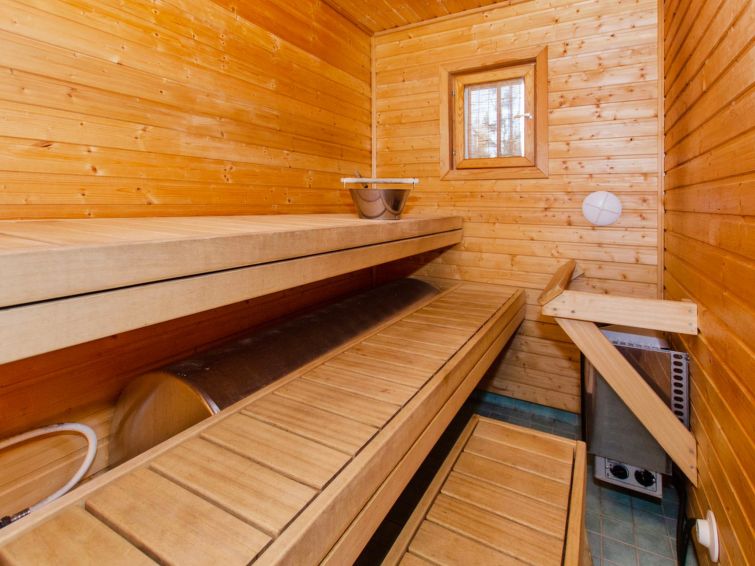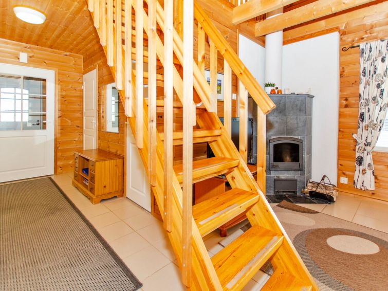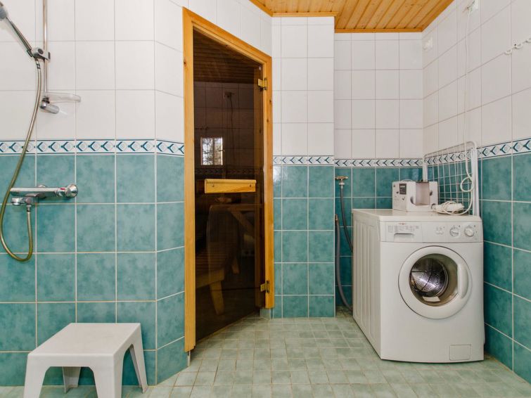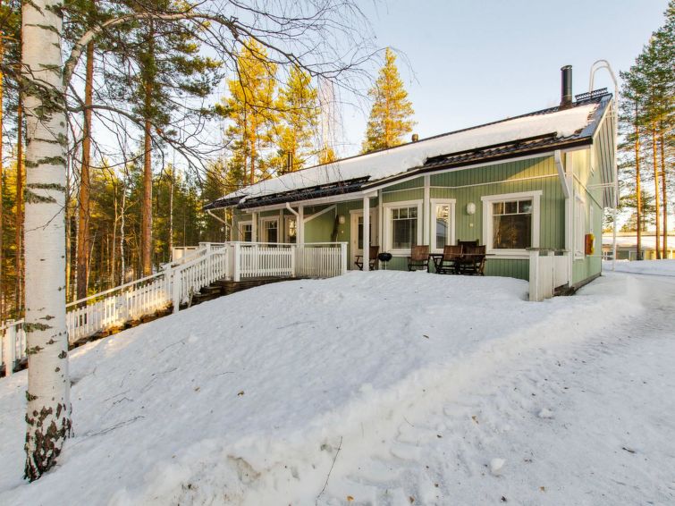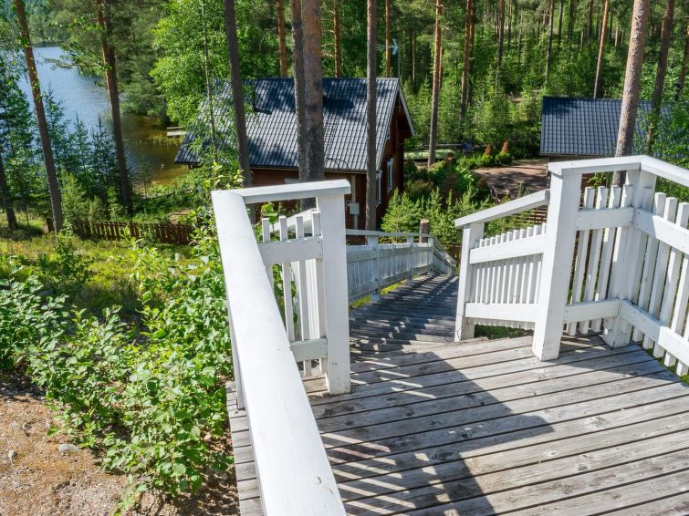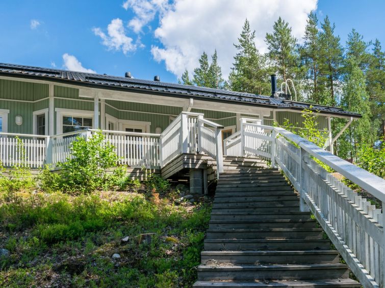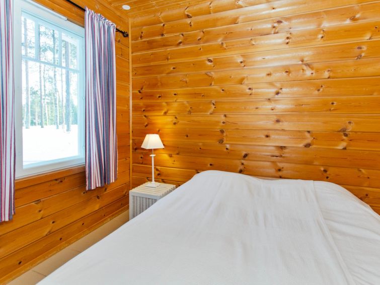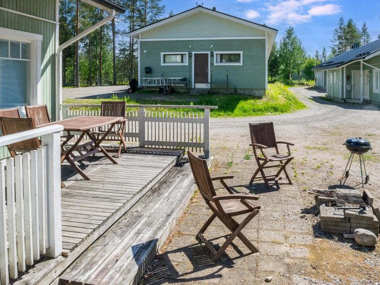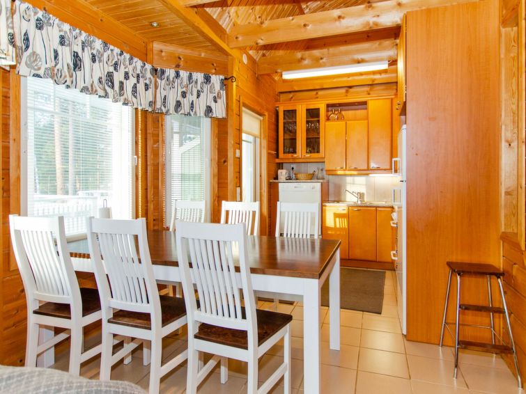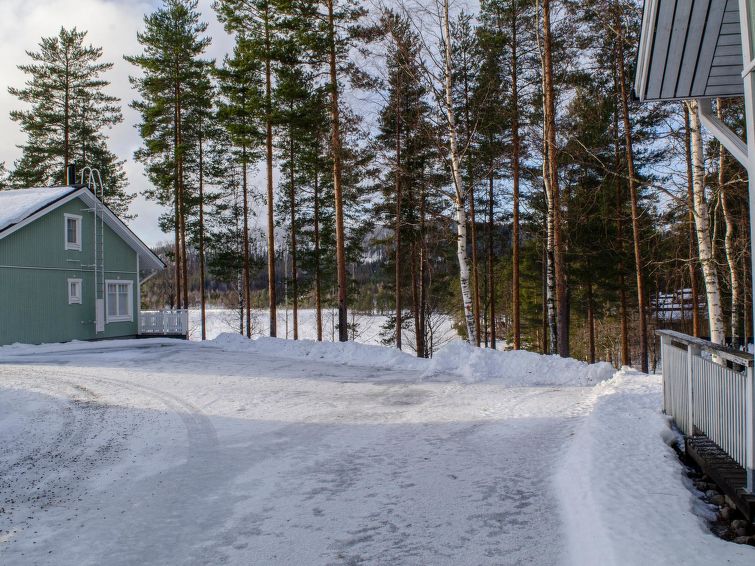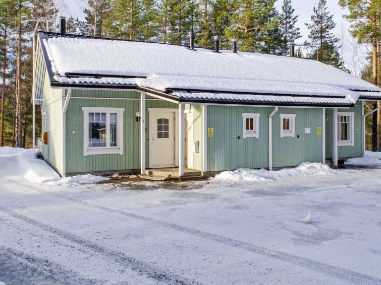 77 north of Joensuu, Pond Käränkälampi 50 m (length 2 km, width 1,5 km), common beach with shallow bottom 70 m along the path down to the beach, Wood semi-detached house 2005, kitchen-living room, small bedroom (with door, but no window) with double bed, bed room with 2 beds, sleeping gallery with 2 beds and convertible sofa, washroom, sauna (elec. stove) and terrace. From the terrace, there are stairs to the shore shared with the second apartment of the semi-detached house. Internet 4 G. There is a tumble dryer and charcoal grill. Good possibilities for down hill and cross-country skiing; Ukko-Koli slopes 9 km. Final cleaning cost will be added to the price.