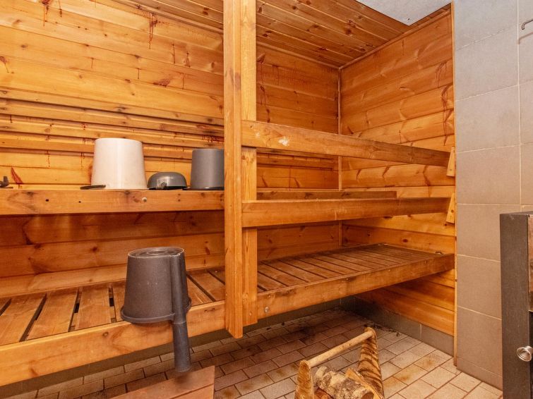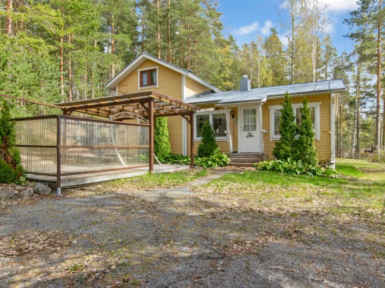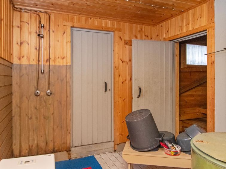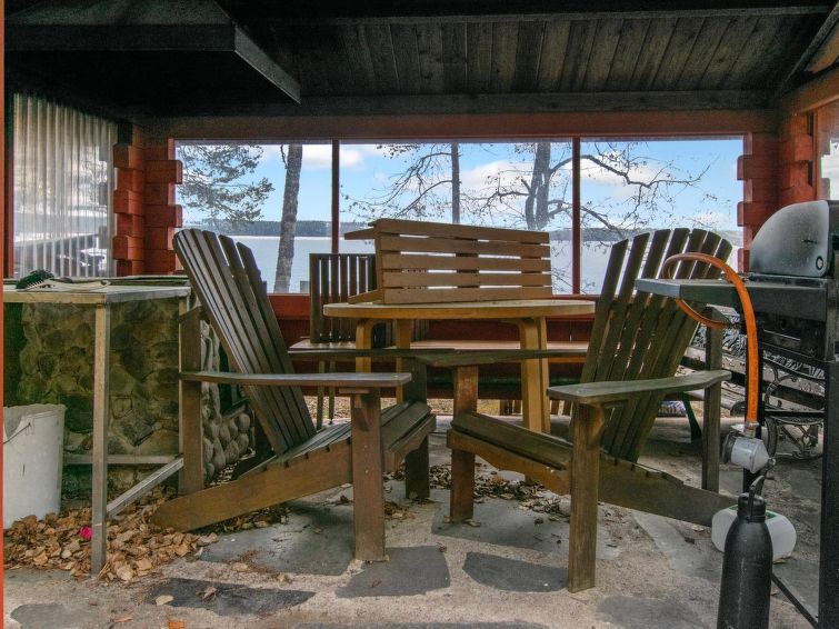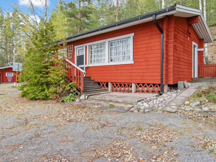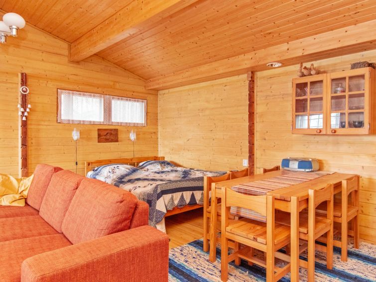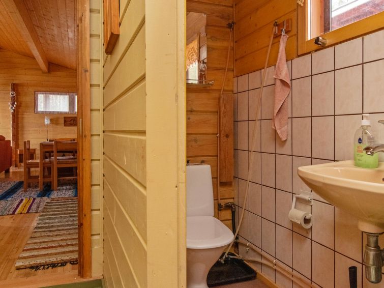 "Log cabin" (65 m²) 1985, partly renovated 2006, large living room with double bed and convertible sofa/double bed, fireplace, mini kitchen, sauna, washroom shower and hot water cauldron (for heating lake water), dressing room, toilet, terrace.