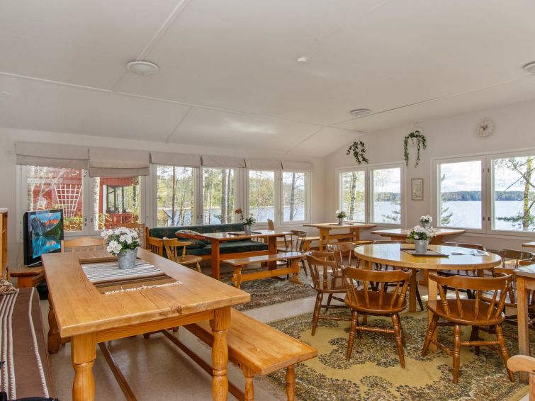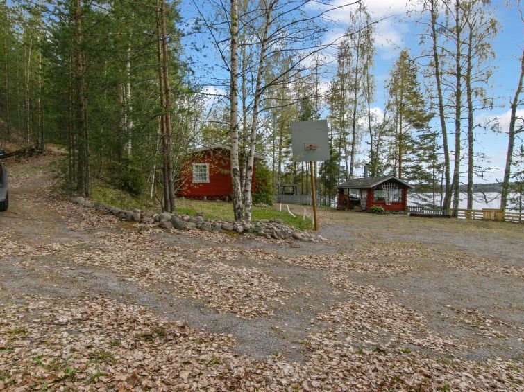Roofed grill, log-built 1985, wood-fired barbecue grill, electric light, cold running water from lake, wash basin. This ideal holiday location for a group comprises a pleasant collection of accommodation buildings. The complete area is rented out at the same time. This previous “holiday village area” location is now privately owned. The plot (6000 m²) is on a slope, with steps down to the lake, a long pier. Shore stony, swimming beach is sandy. Grass and planted shrubs, etc.